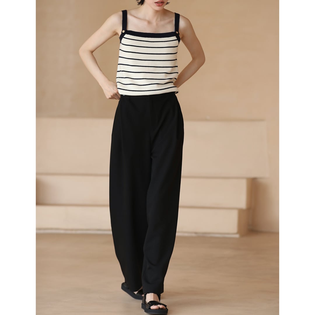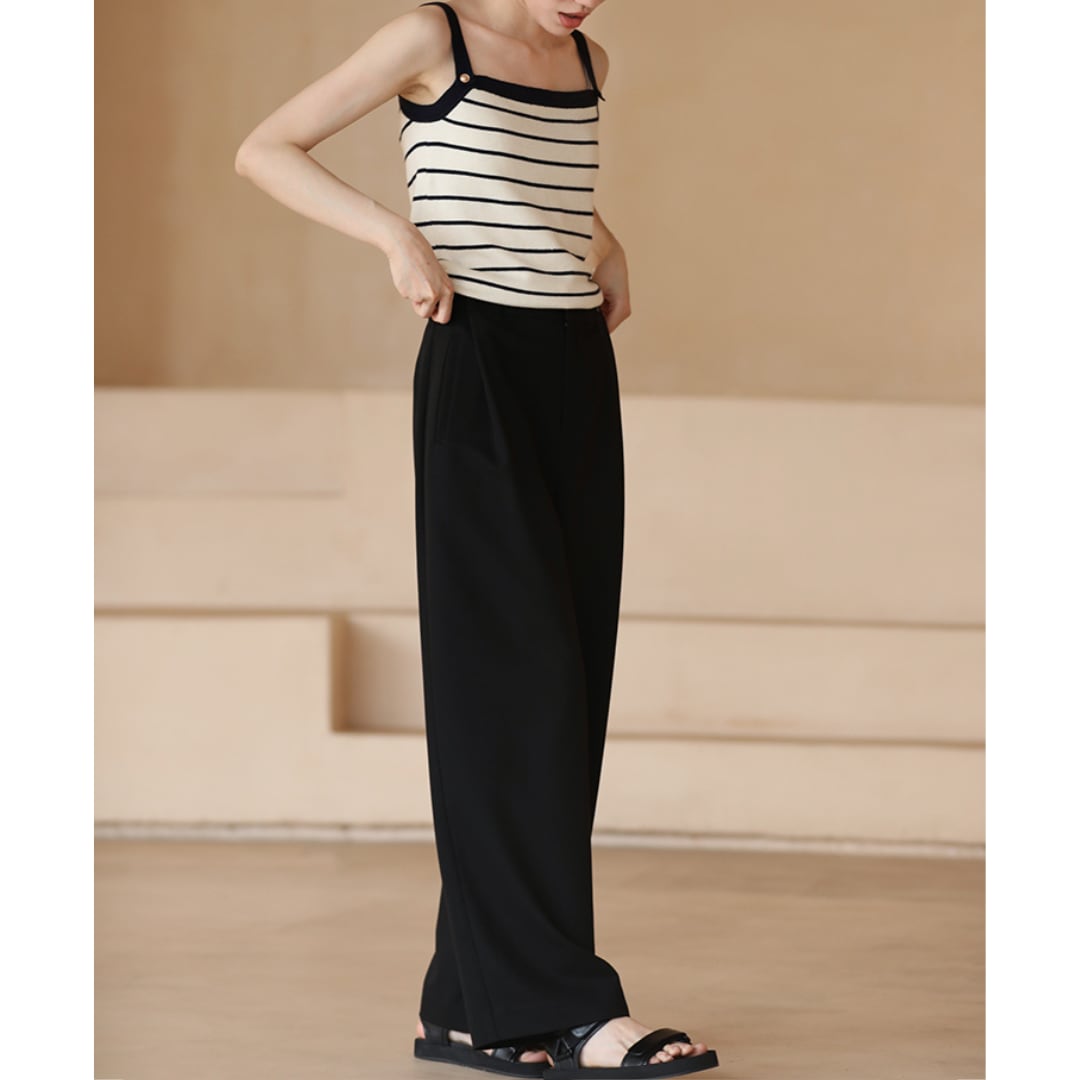 シルエットが命のブラックワイドパンツは、ストンと美しく縦ラインを描き、脚長効果は抜群。
