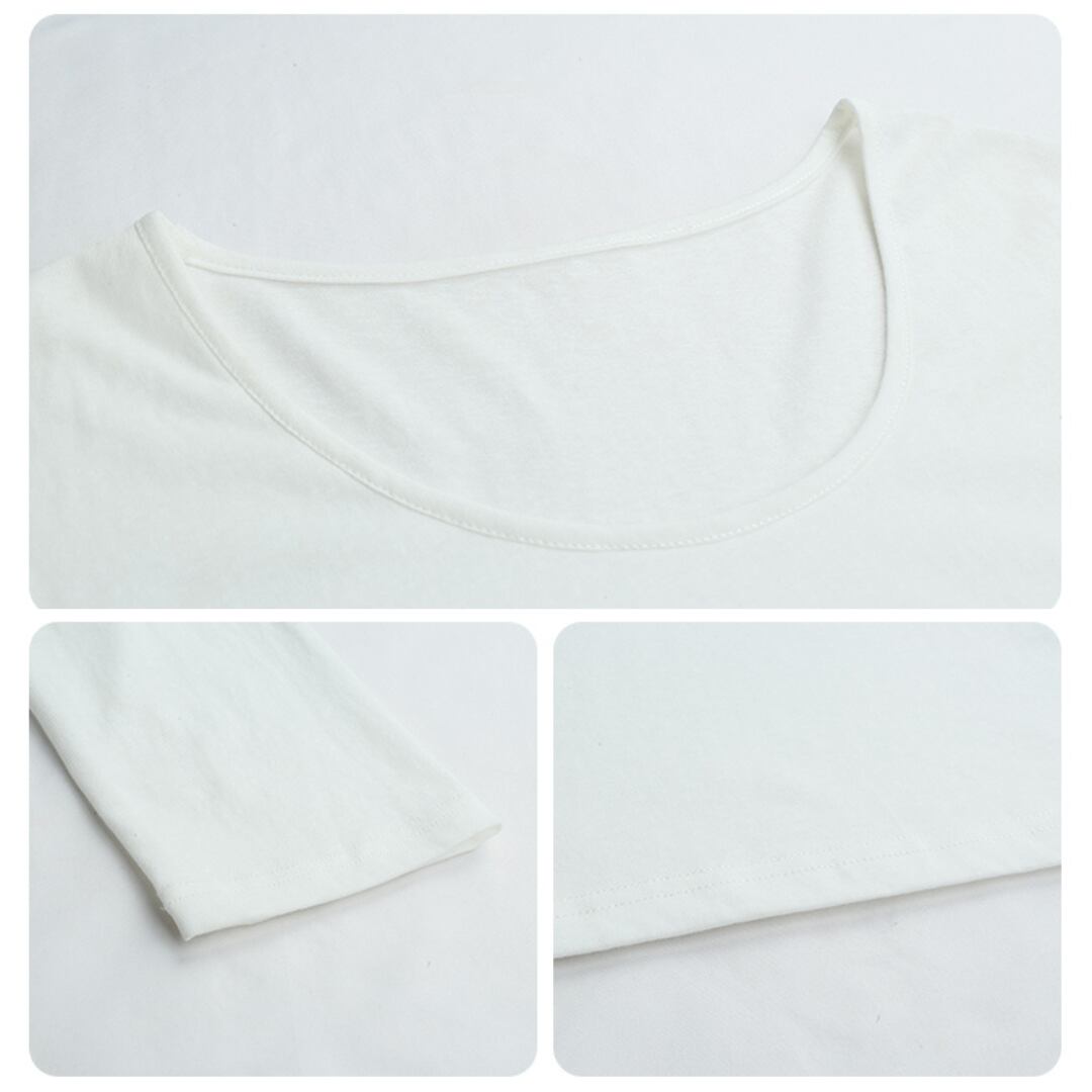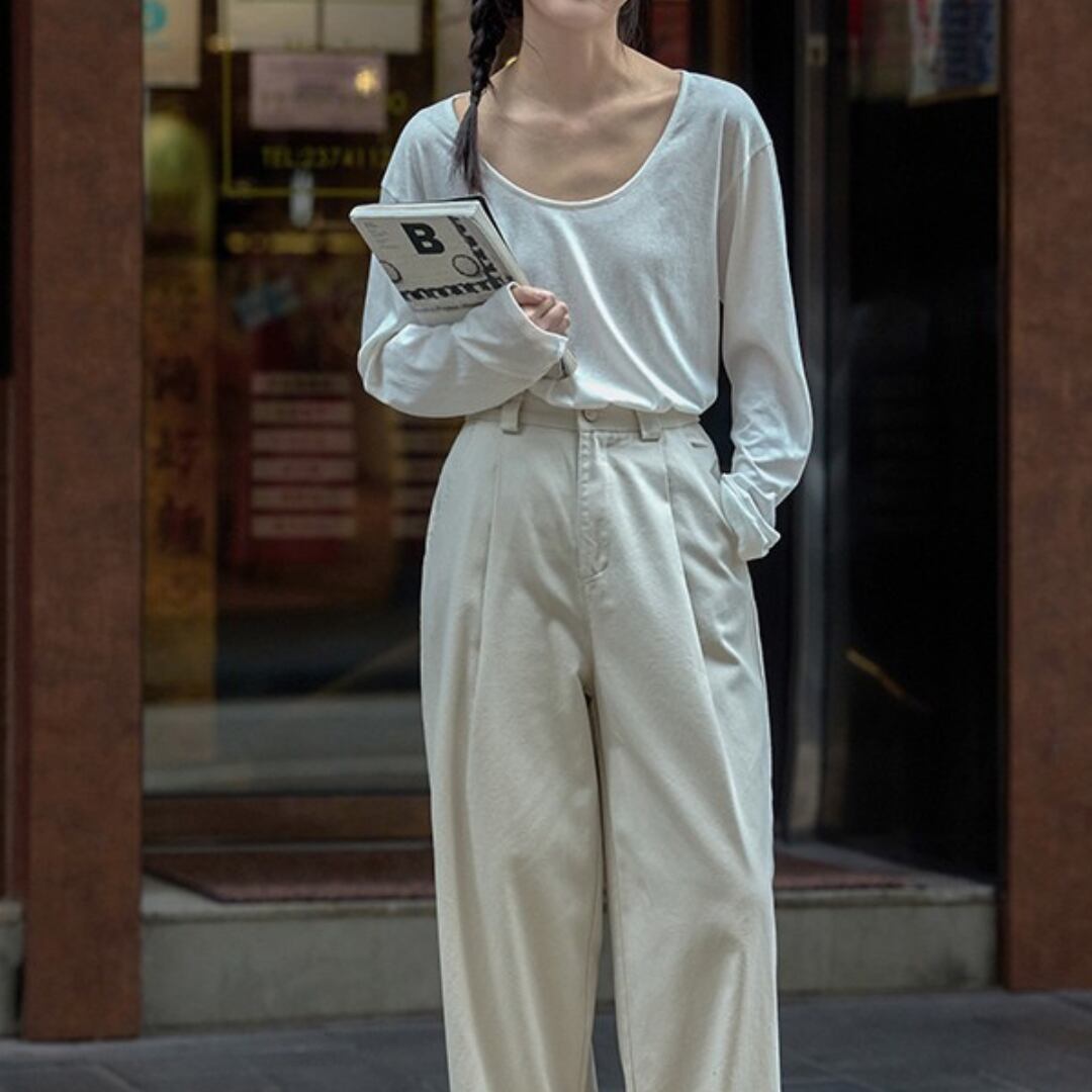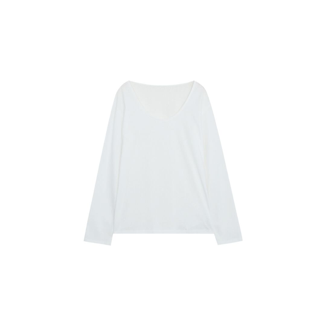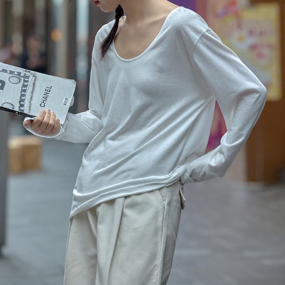 深めのUネックがデコルテを美しく見せ、女性らしさを引き立てる絶妙なシルエット。