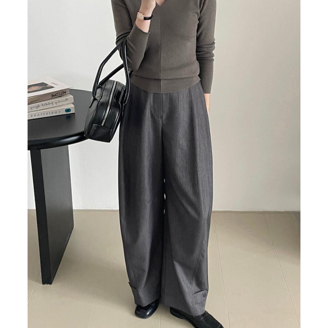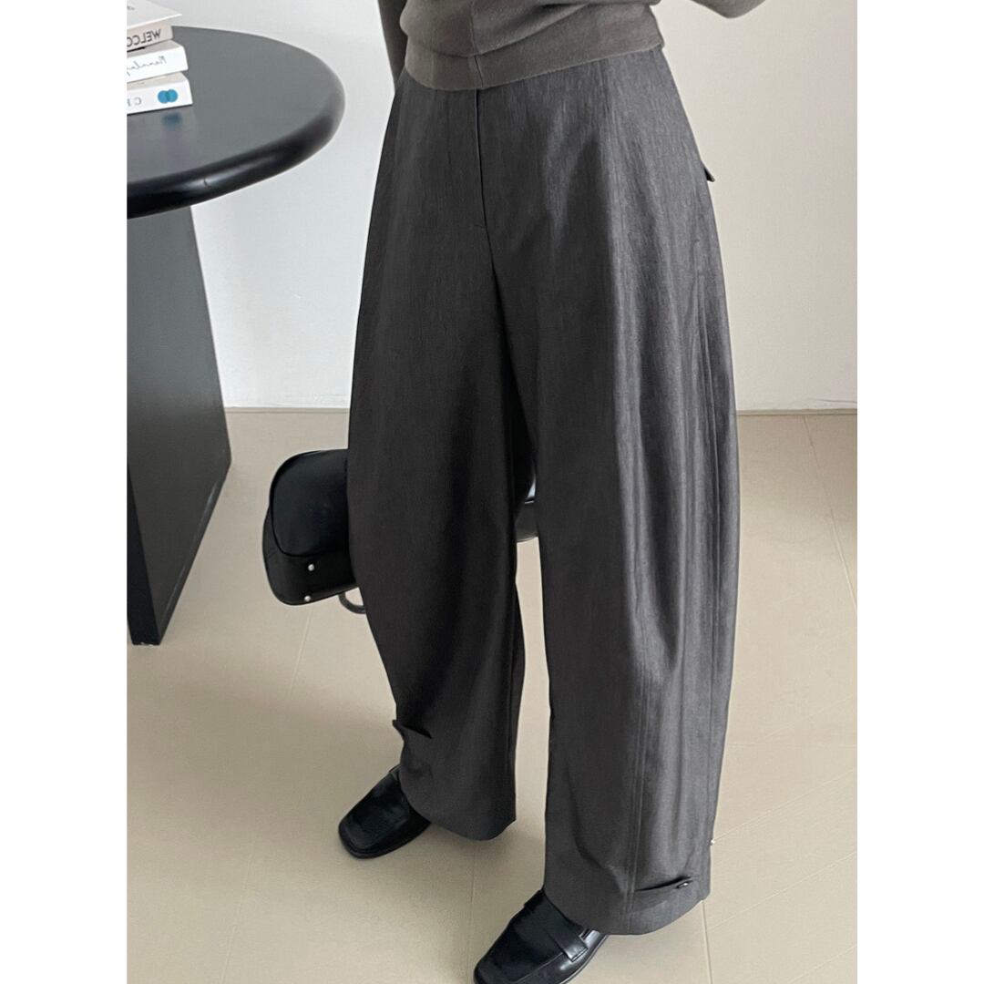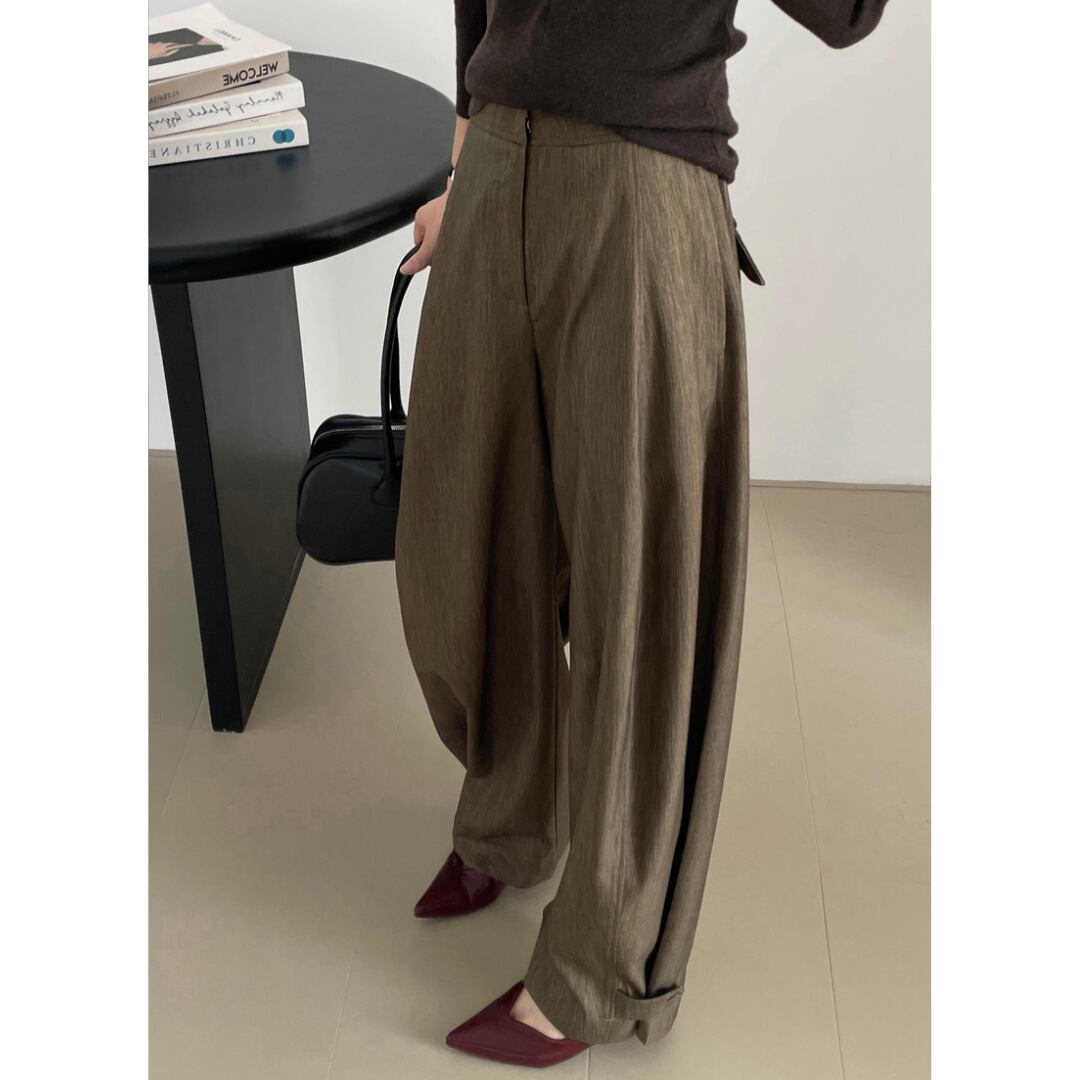ニュアンスカラーで、どんなトップスにもすんなり馴染むのが魅力のワイドパンツ。