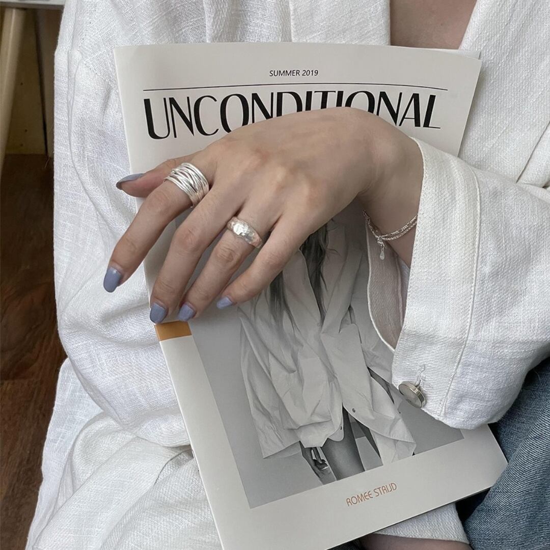 ひとつで重ね付けしているようなボリューム感を演出する、存在感抜群のシルバーリング。