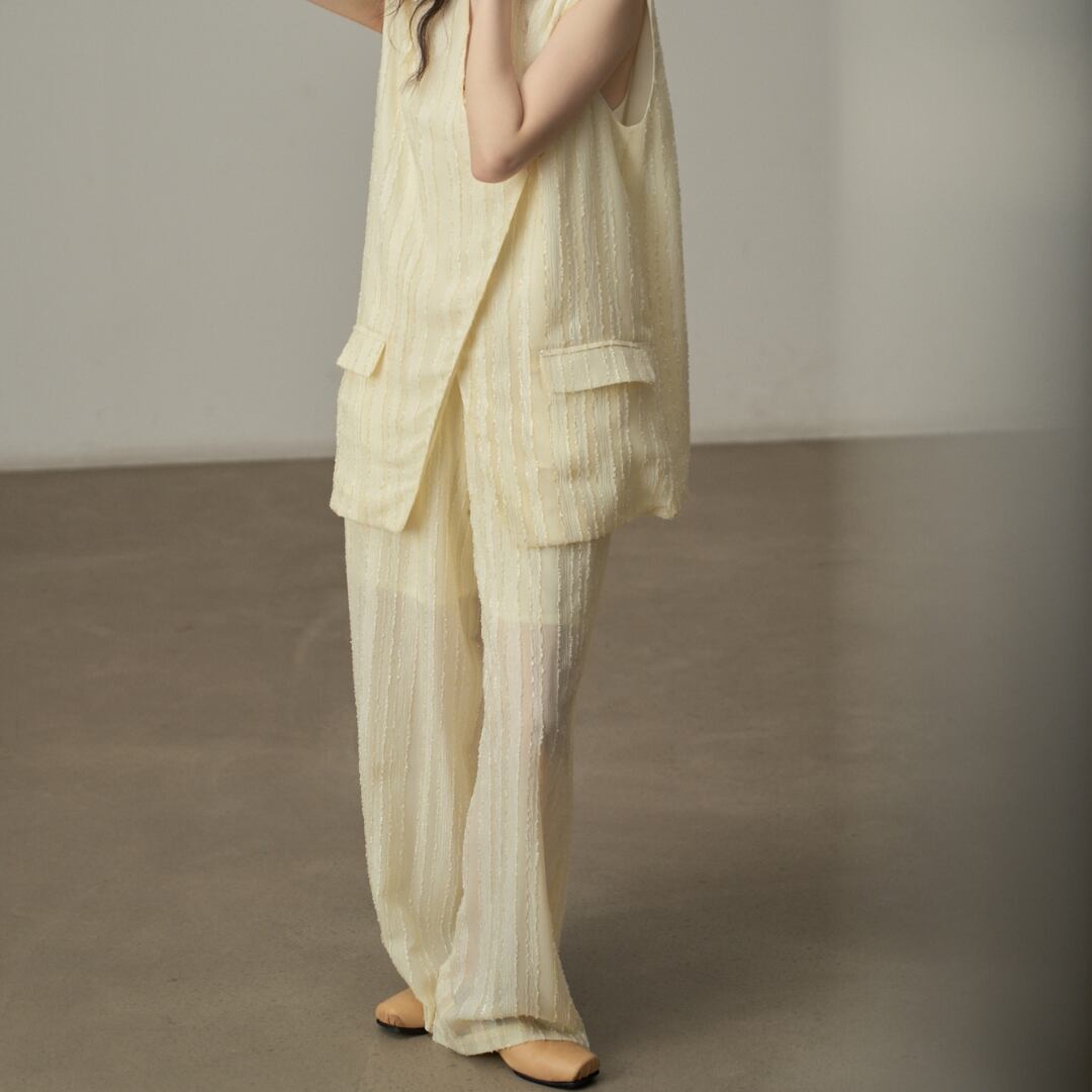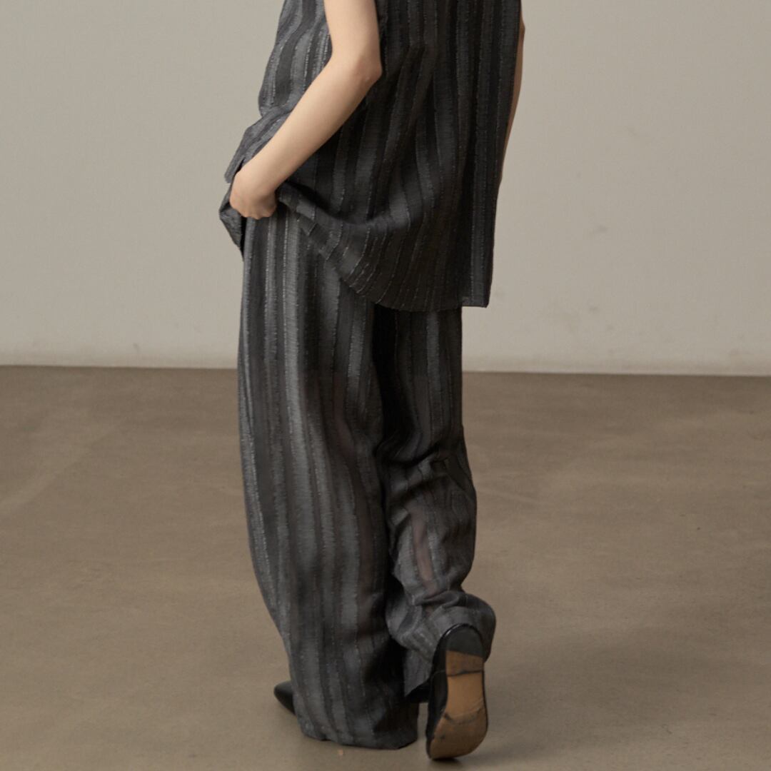 縦に流れるような繊細ストライプが大人の抜け感を演出し、ウエストは総ゴム仕様で、ストレスフリーな穿き心地を実現した1本です。