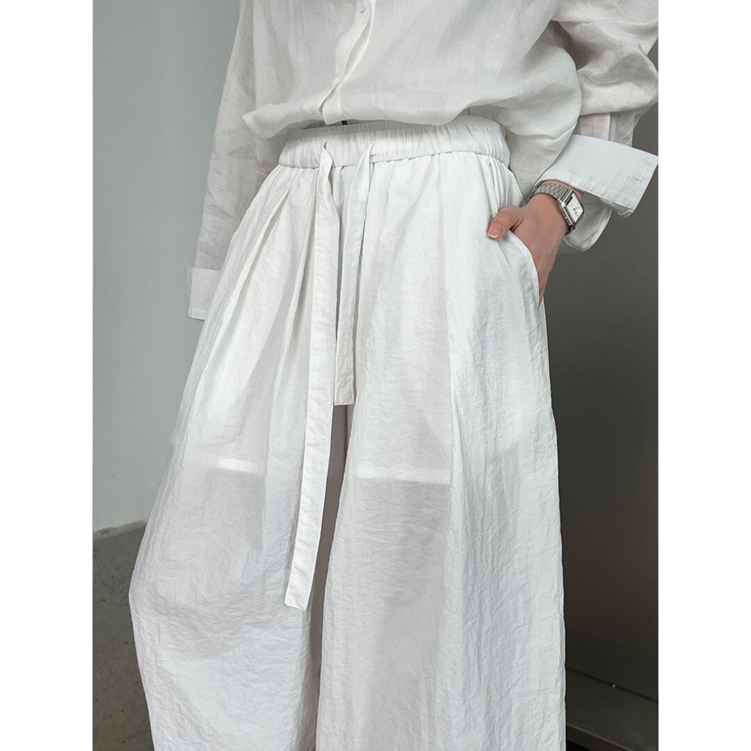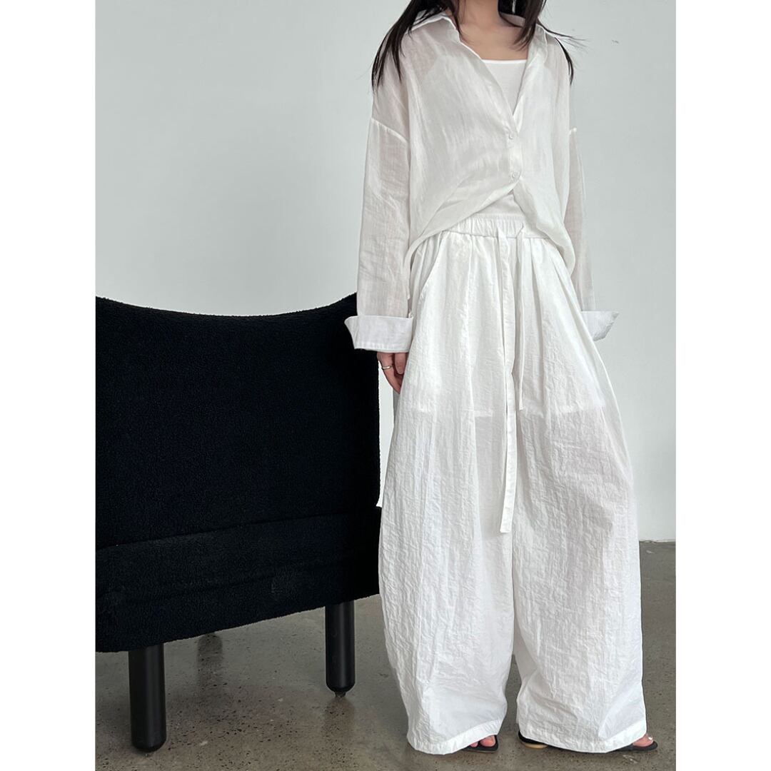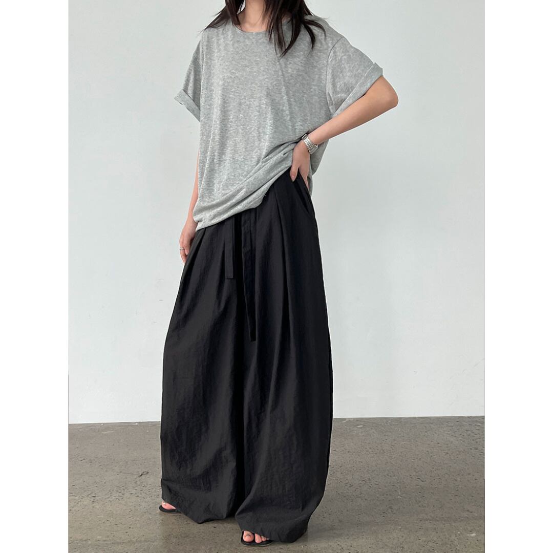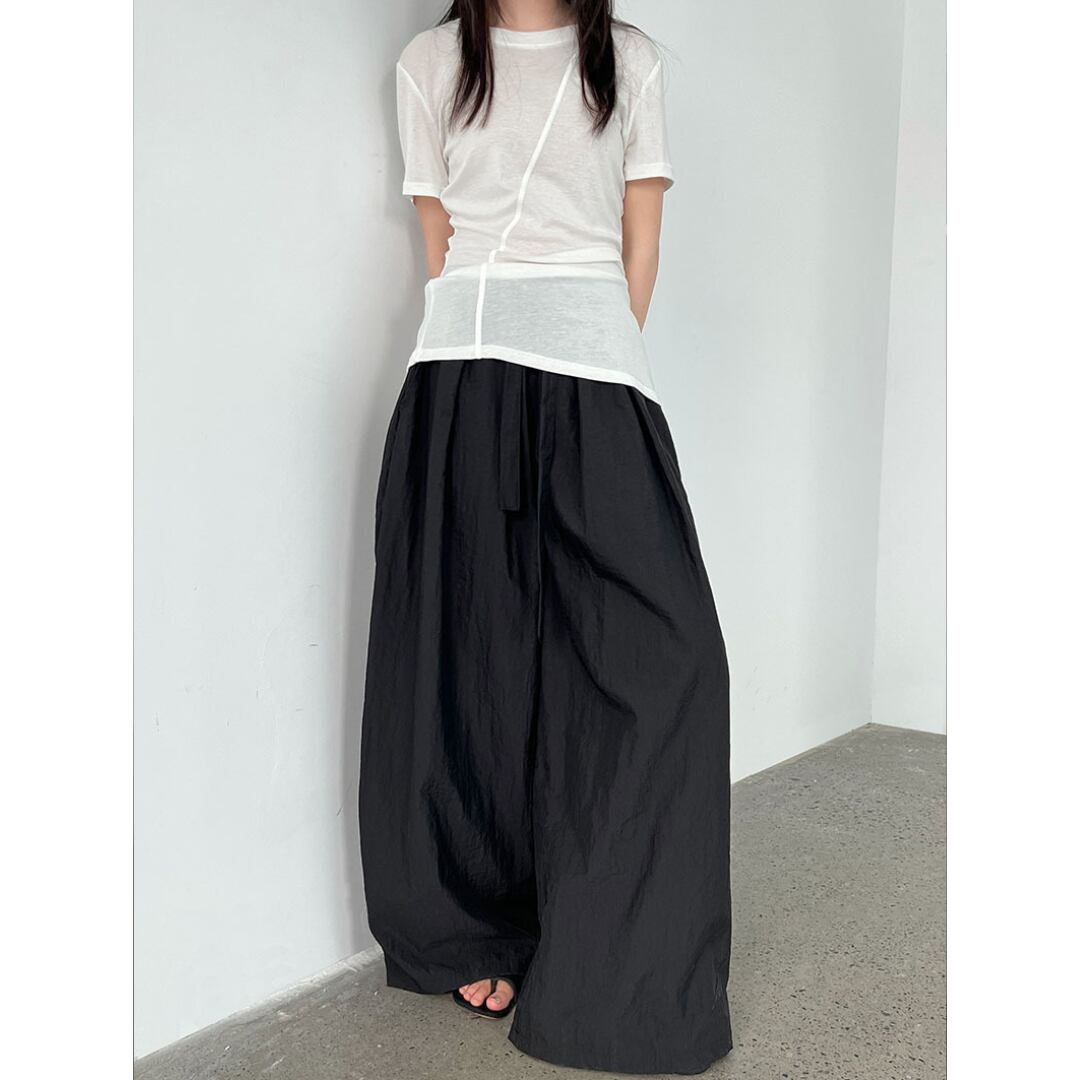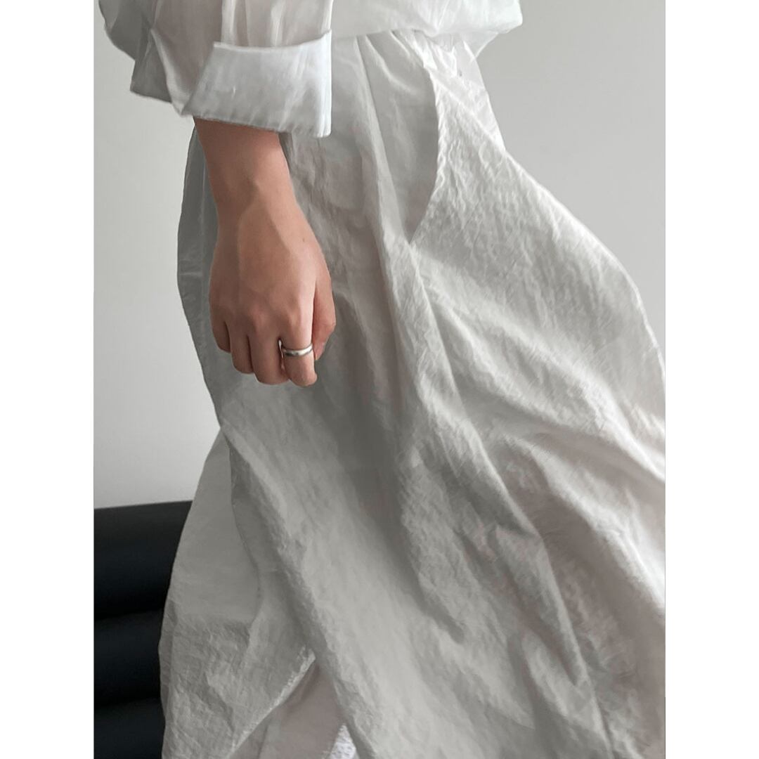 ほんのり光沢×シワ感な軽やかな生地感に、さりげないシワ加工と落ち感が美しく、モードにもナチュラルにも着回せる万能デザイン。
