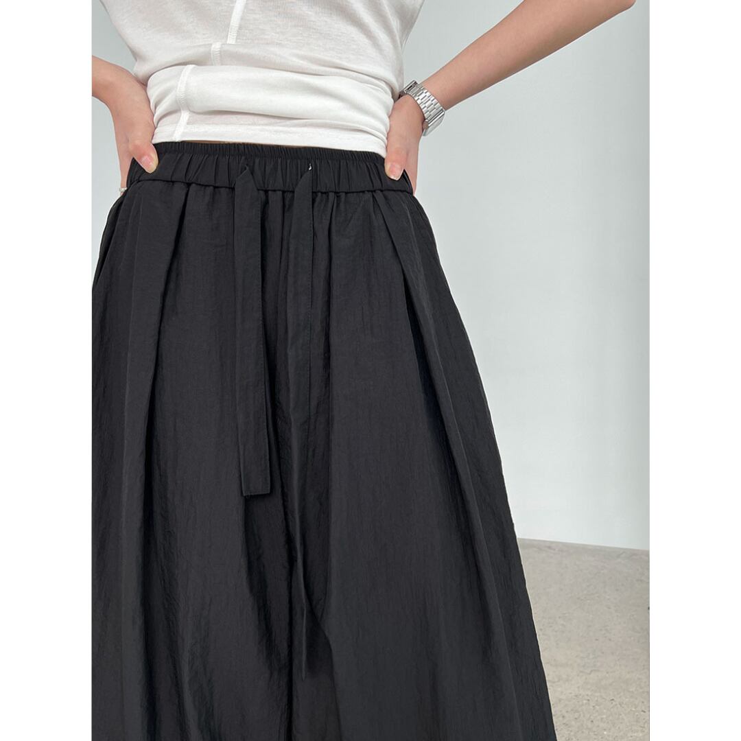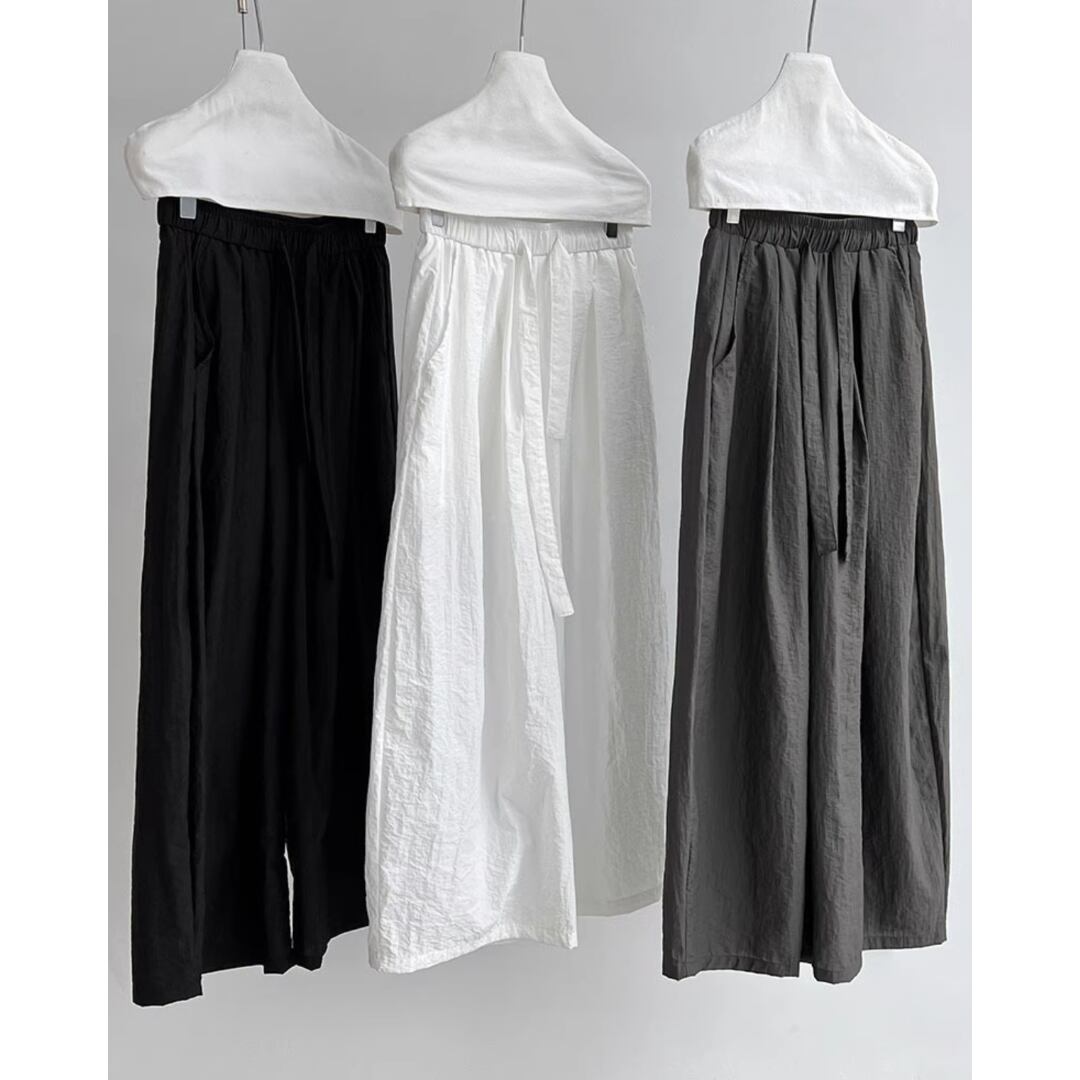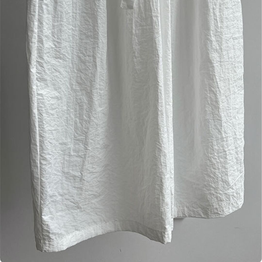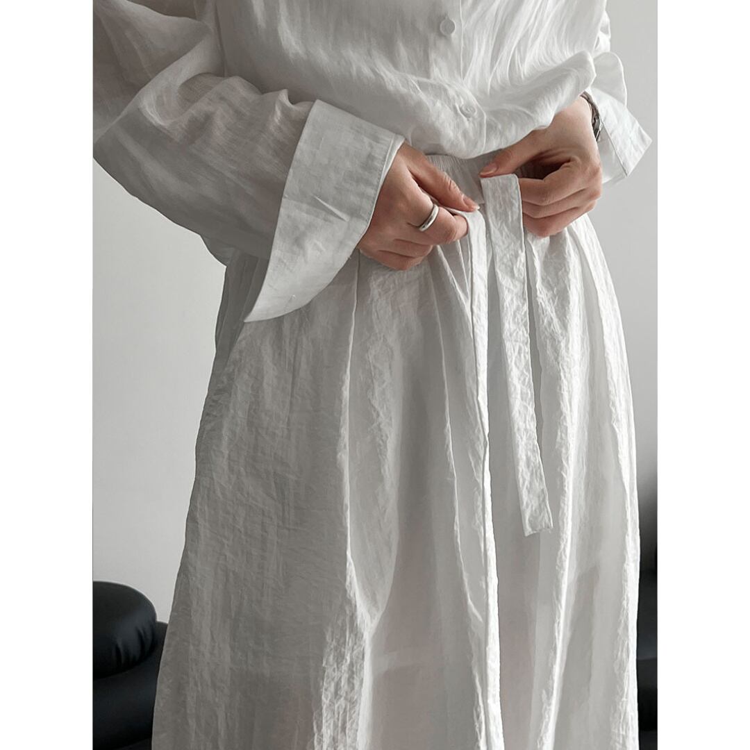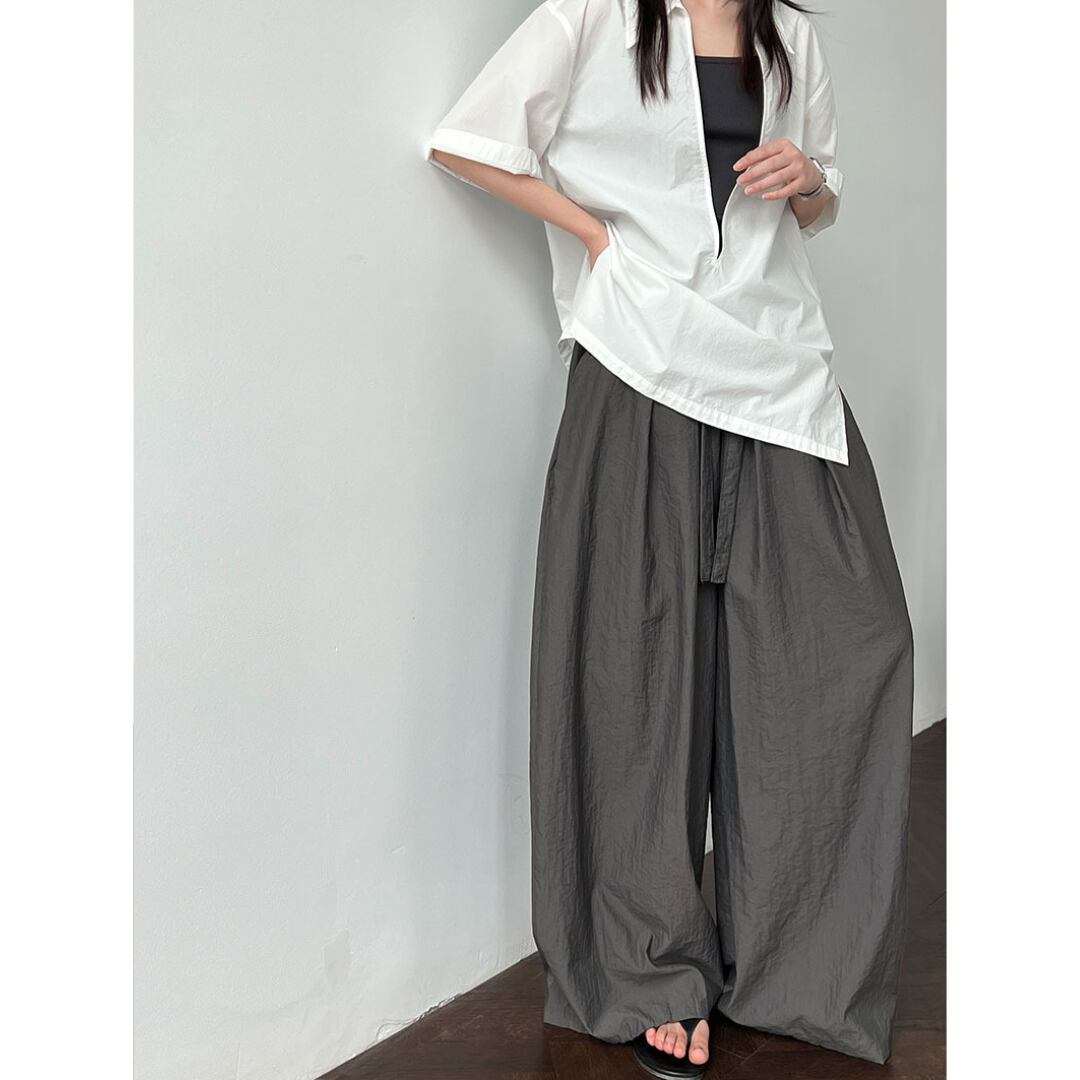 ほんのり光沢×シワ感な軽やかな生地感に、さりげないシワ加工と落ち感が美しく、モードにもナチュラルにも着回せる万能デザイン。
