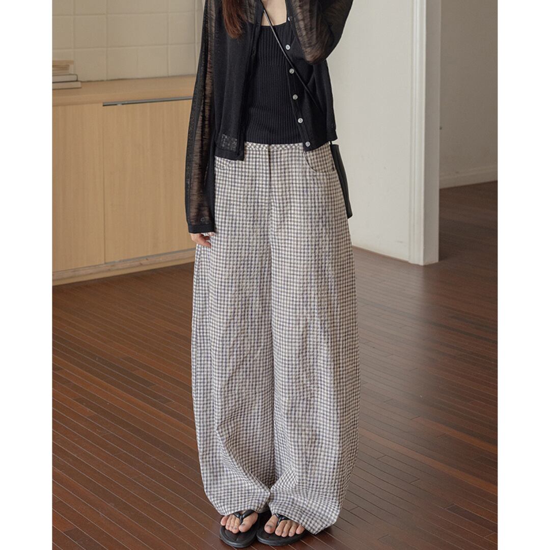 クラシックなギンガムチェックに、ゆったりとしたワイドシルエットが好バランス◎