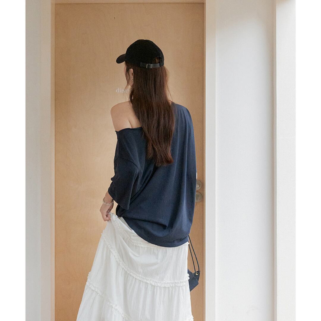 ゆるっと落ち感のあるシルエットと、オフショルダーで抜け感はたっぷり◎
