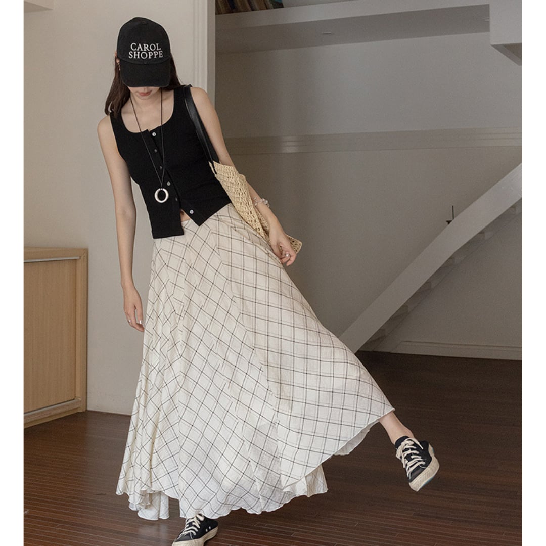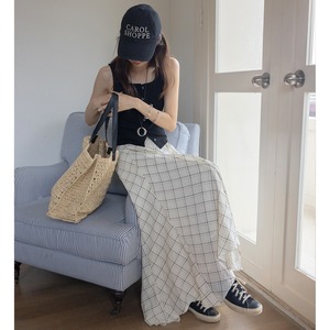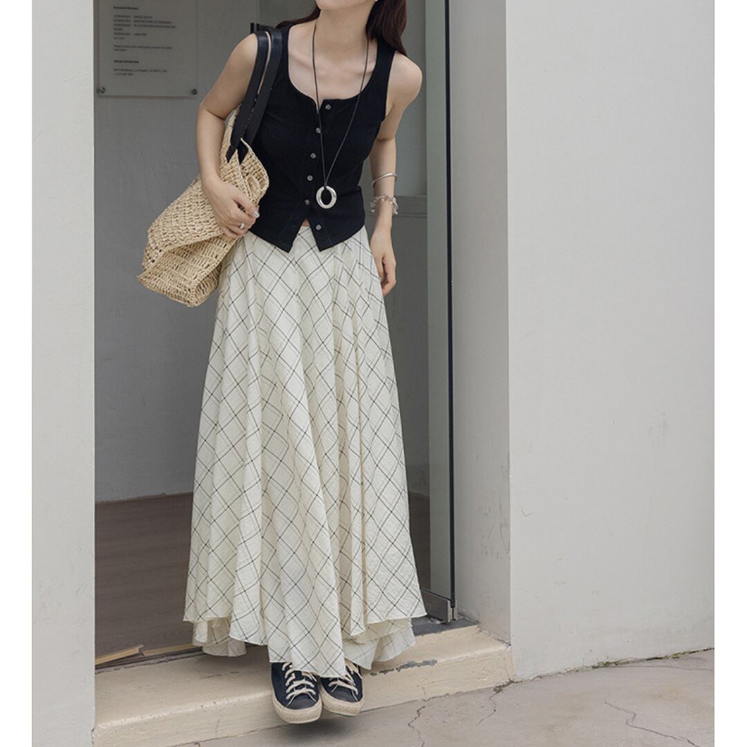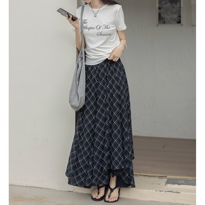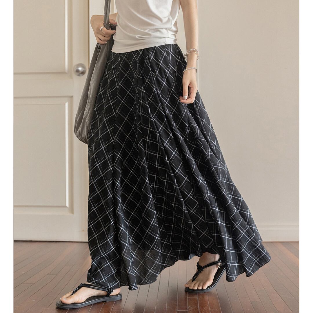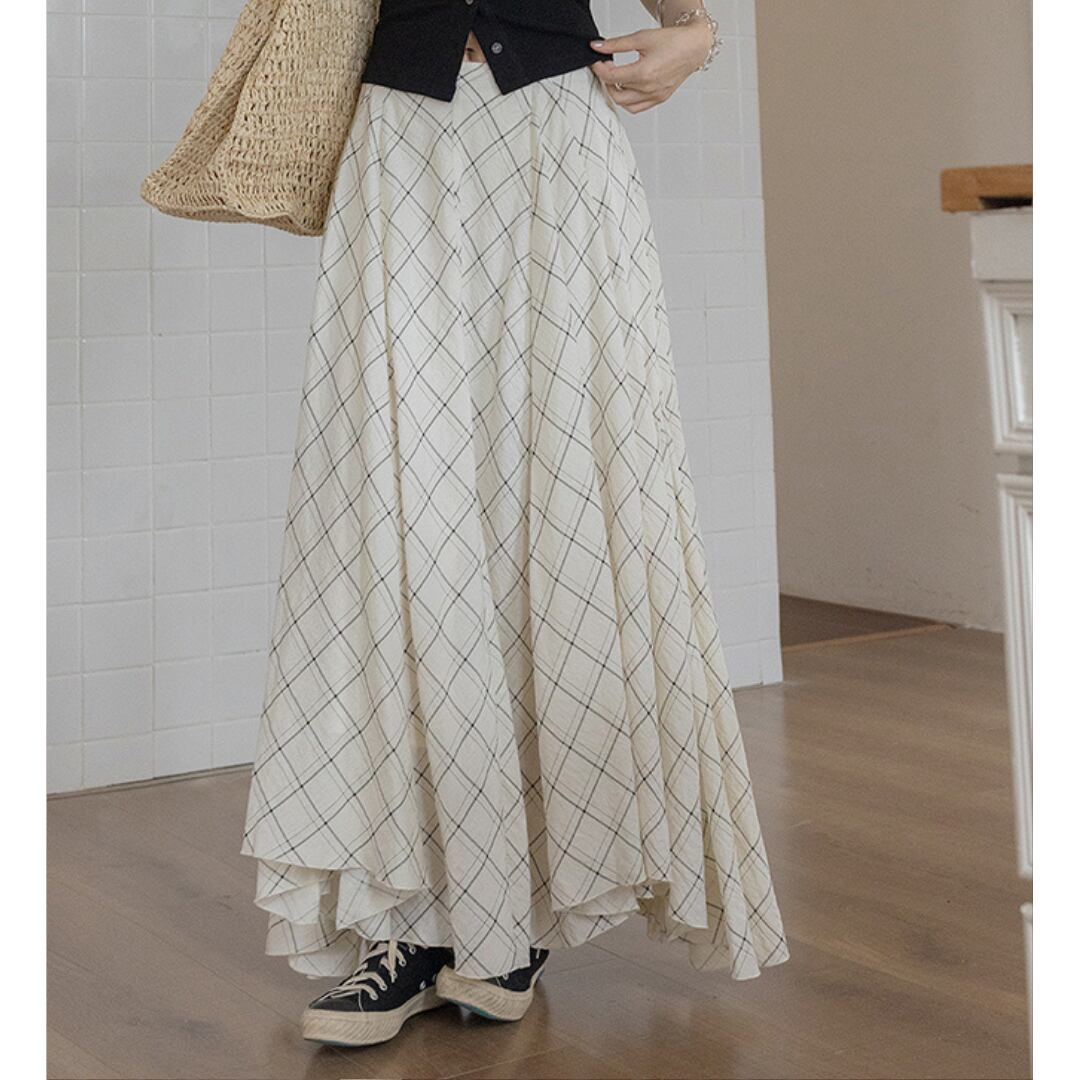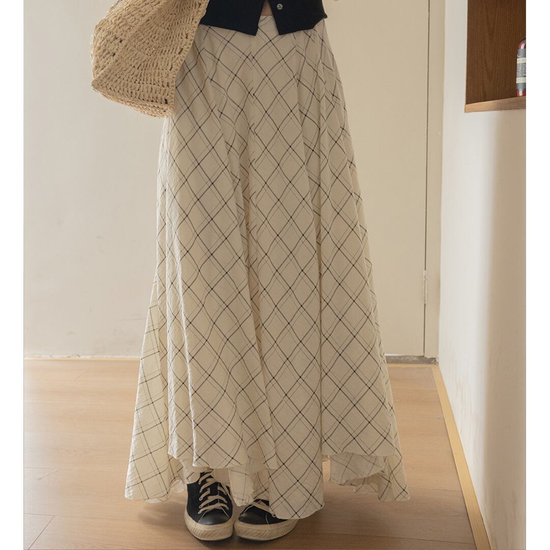 歩くたびに揺れるシルエットと、落ち着いたチェック柄が着こなしやすいロングスカート。