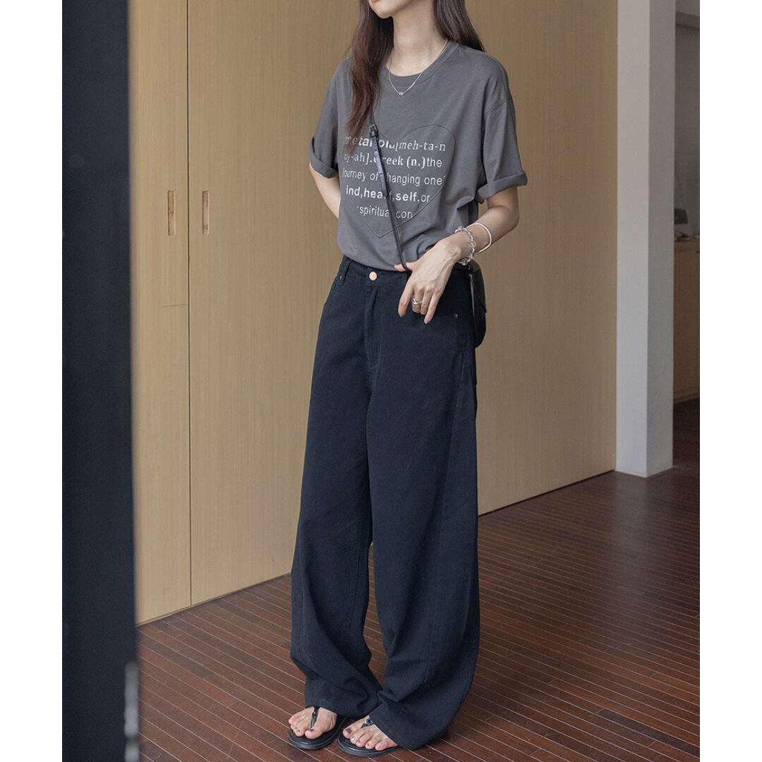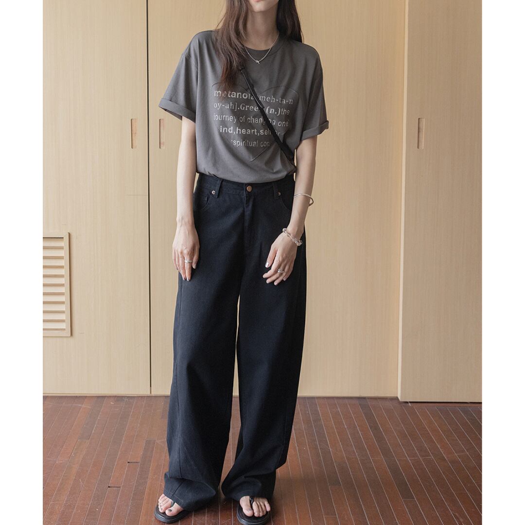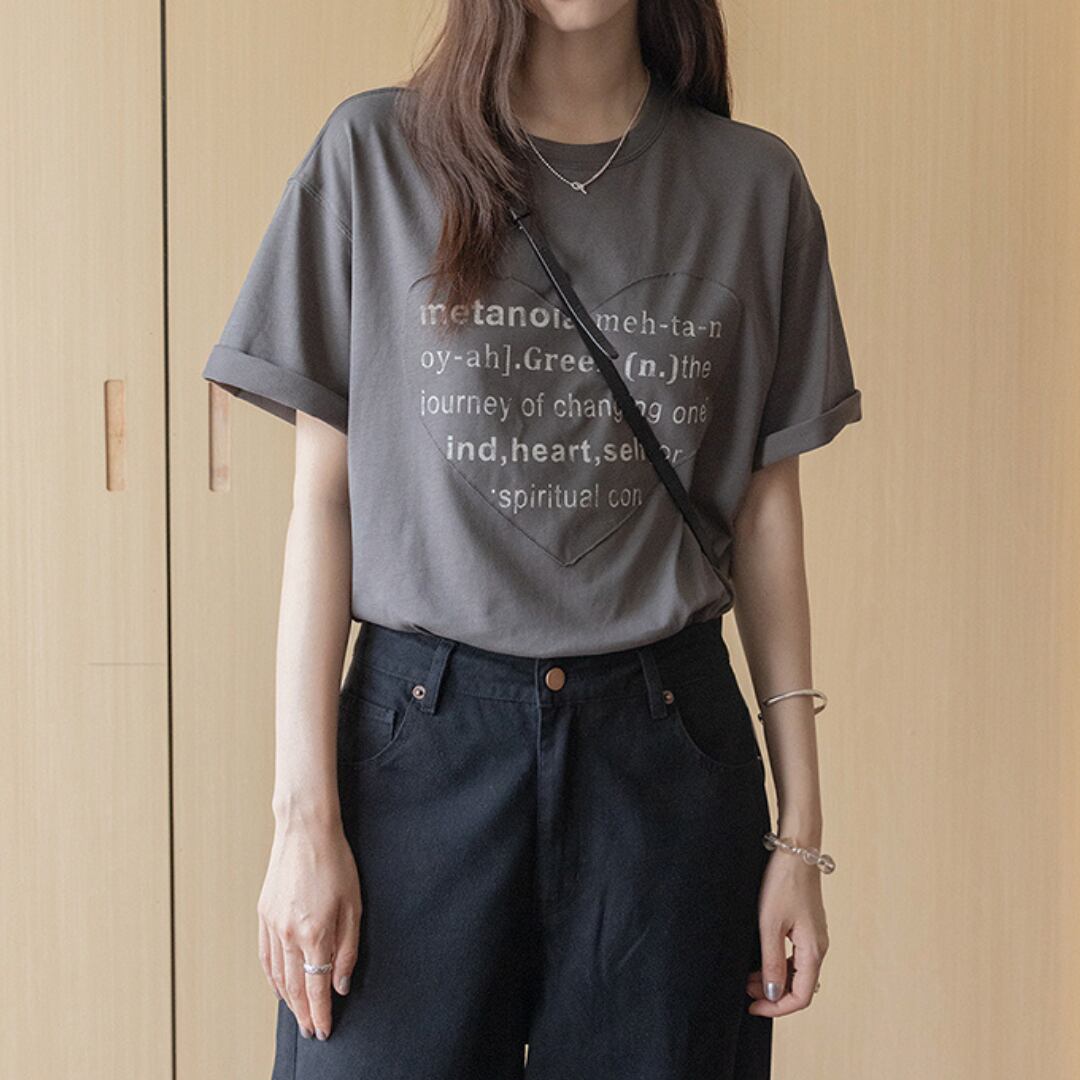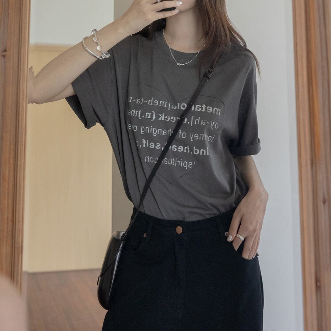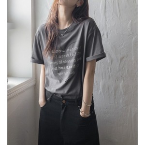 くすみグレーに英字のプリントが効いた、大人のデイリーTシャツ。