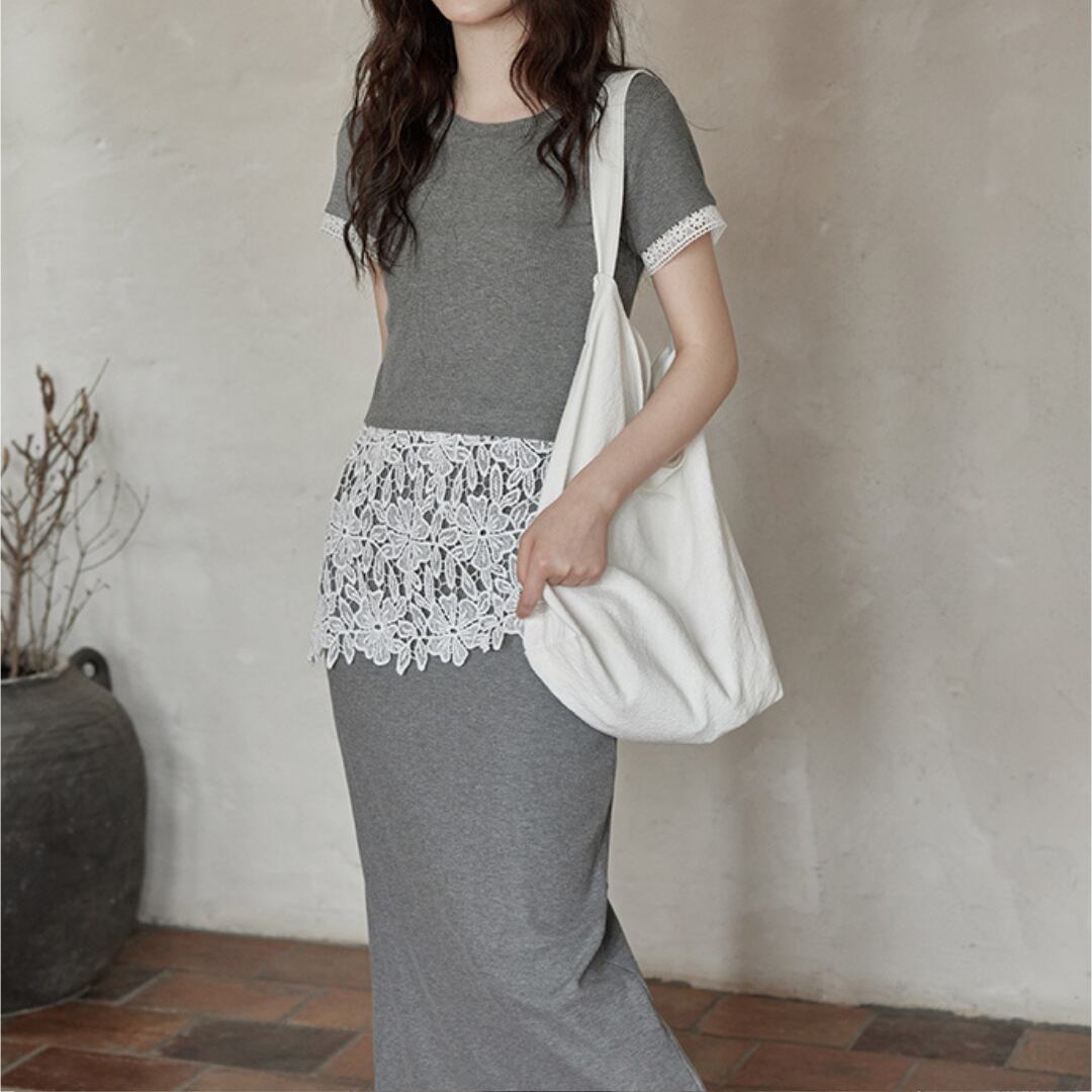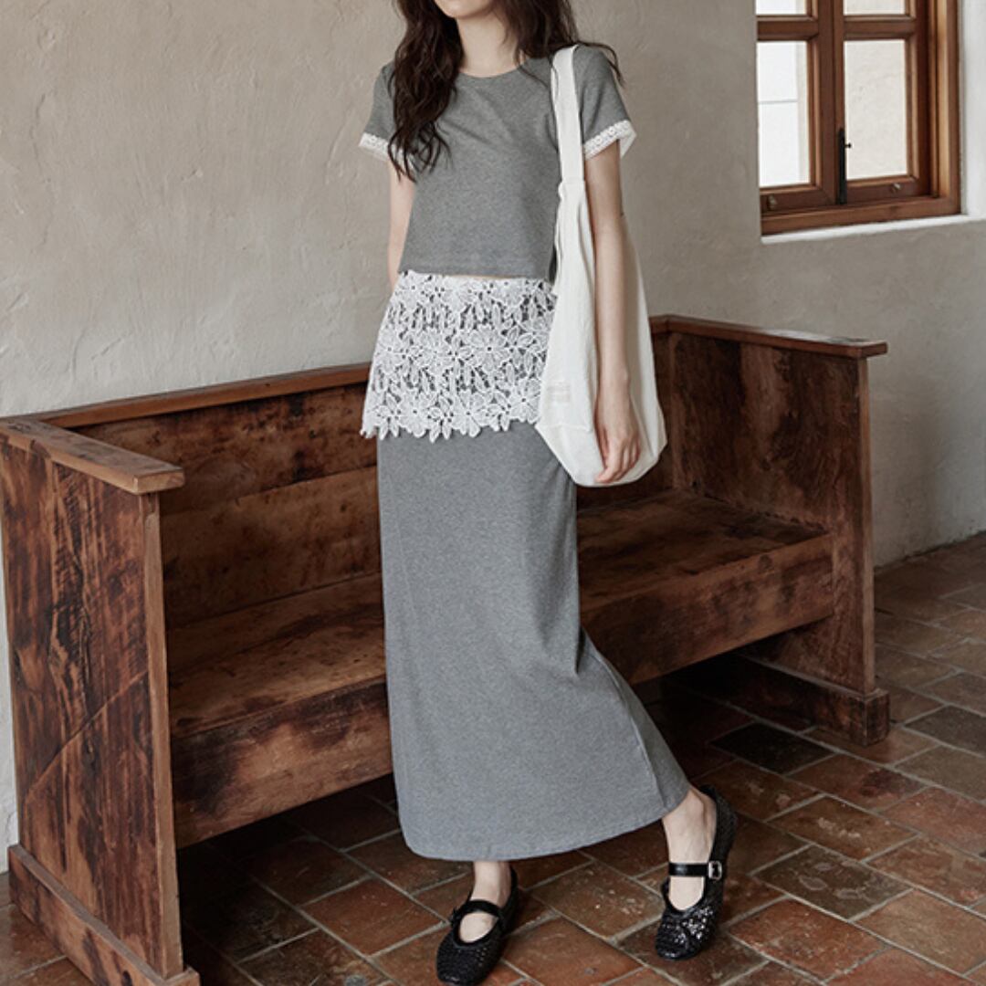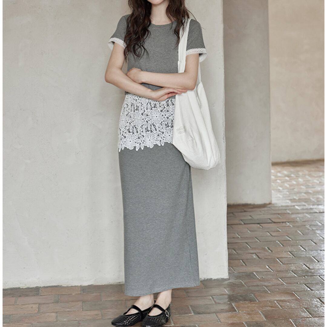 スカートに施された花柄レースが、カジュアルなグレーのカットソーワンピースに華やぎを添えるセットアップ。