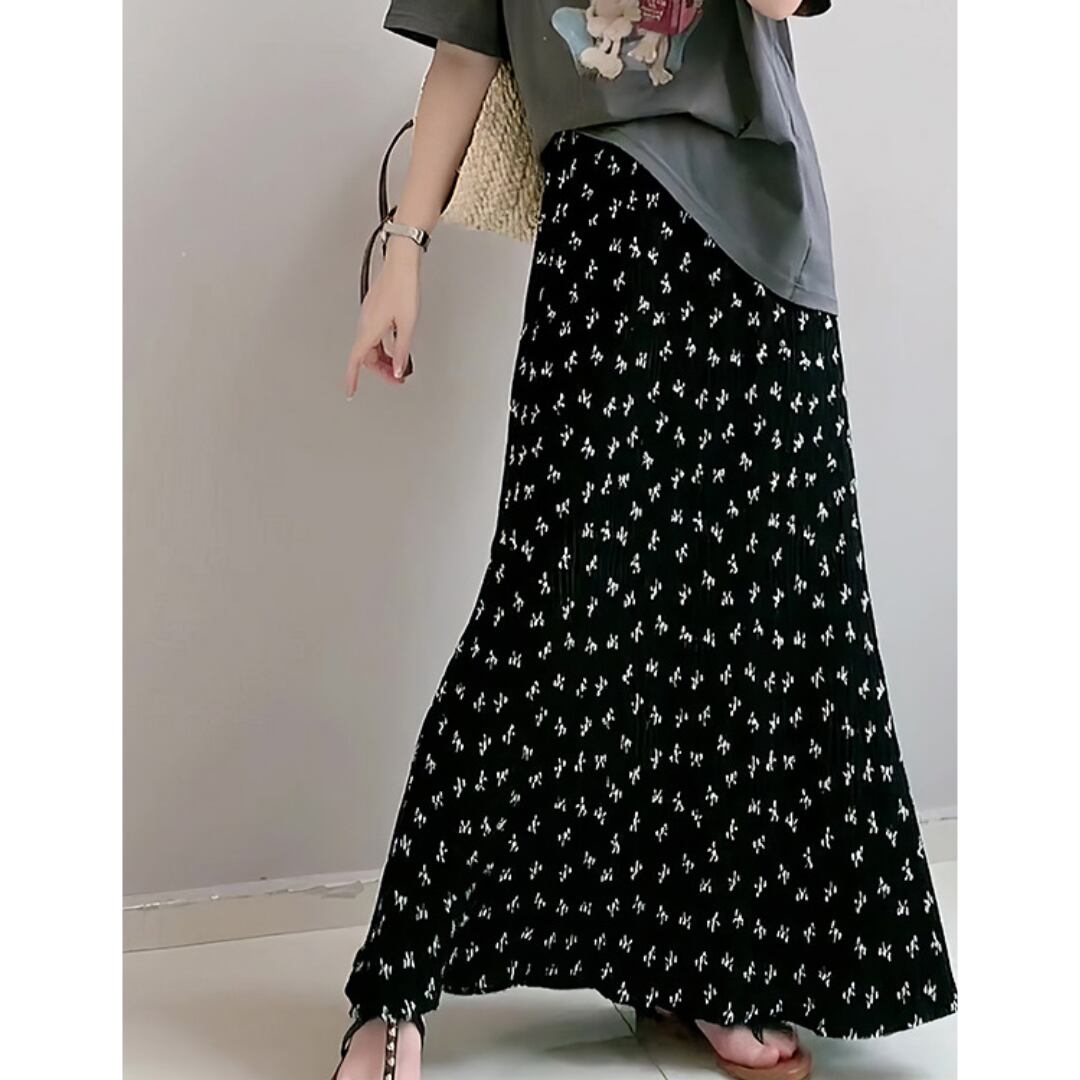 細やかなリボン柄が全体にあしらわれた、大人フェミニンなロングスカート。