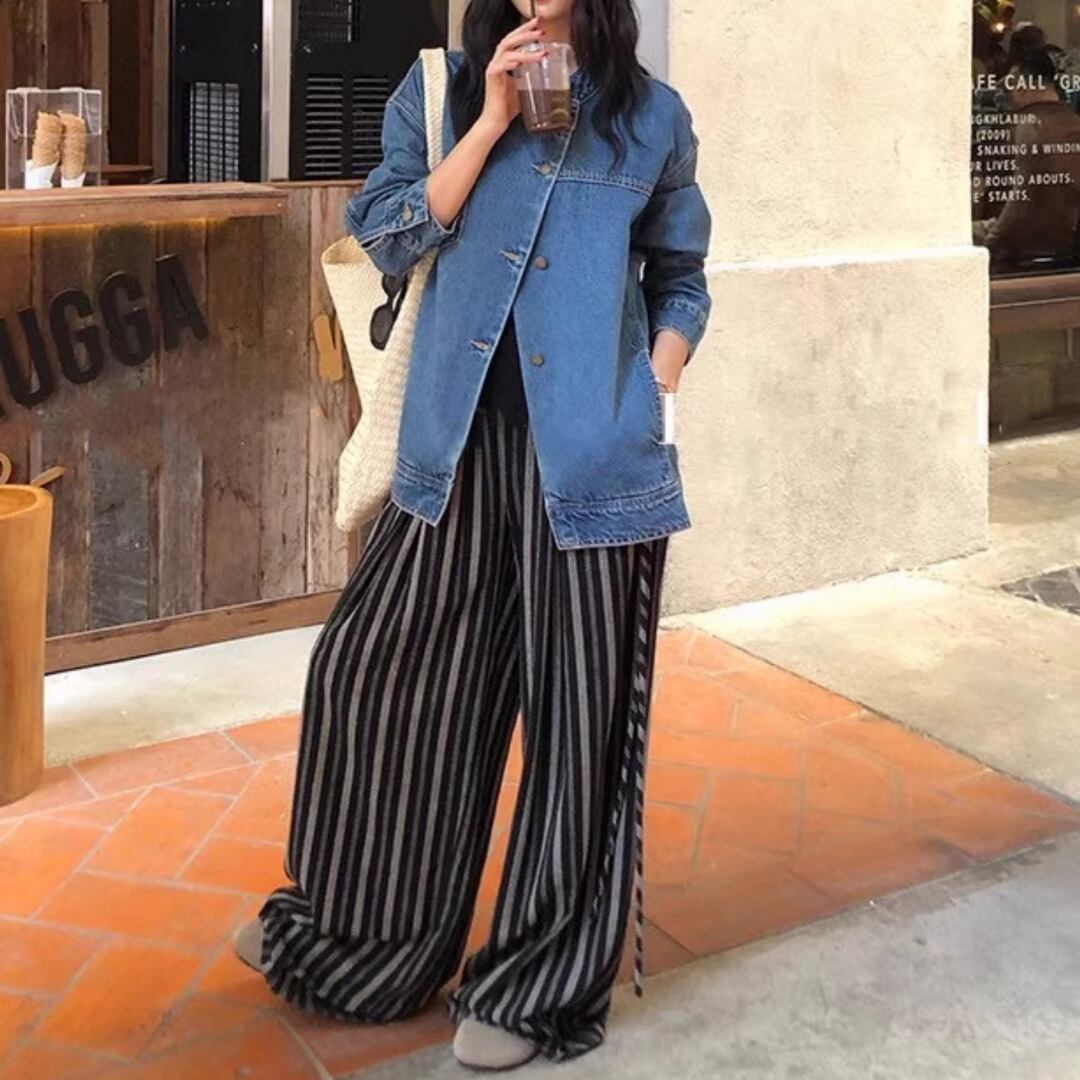 ゆるっとしたワイドシルエットと、表情のあるストライプ柄がこなれた印象をプラス。