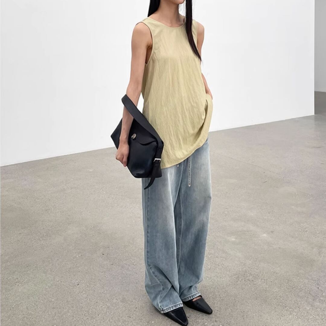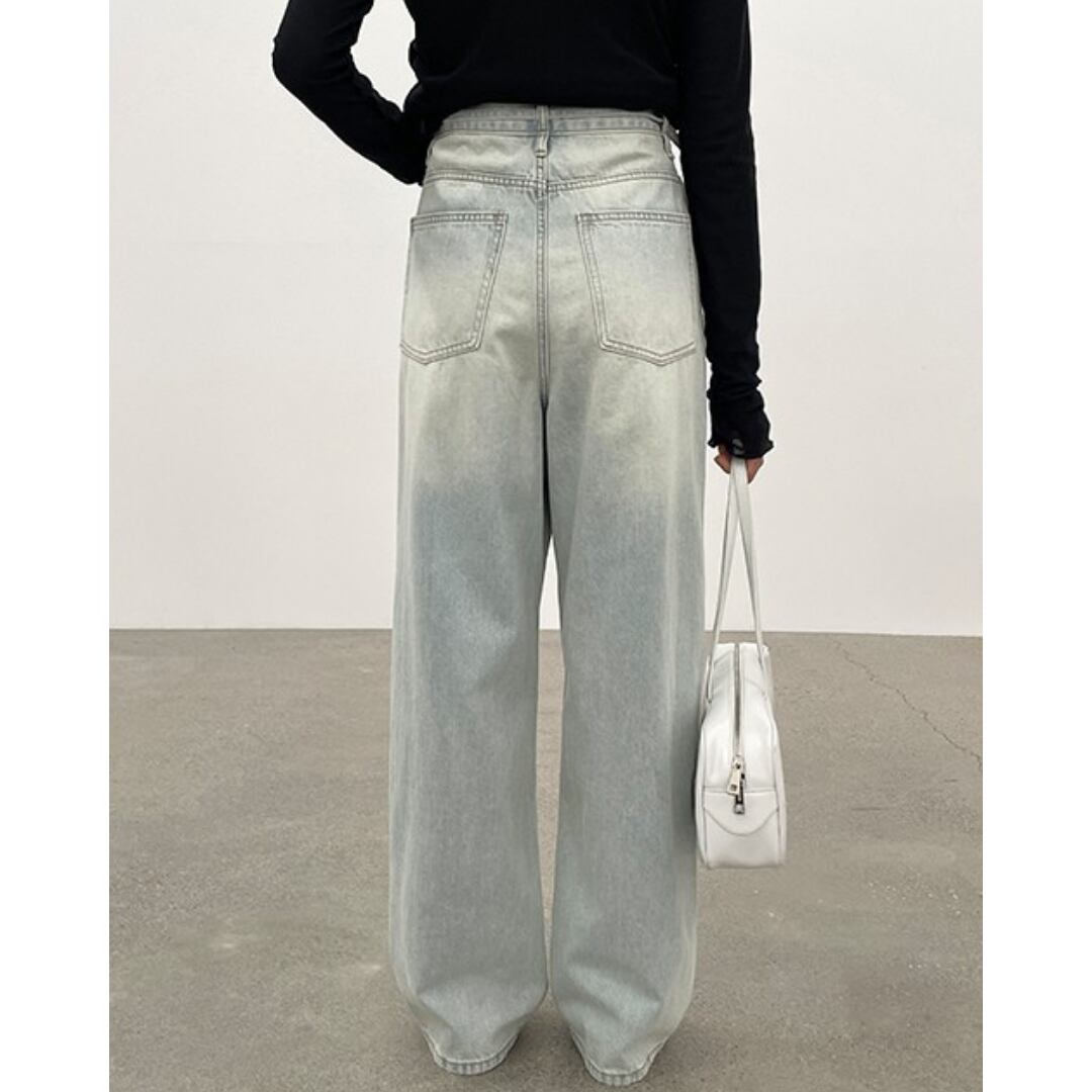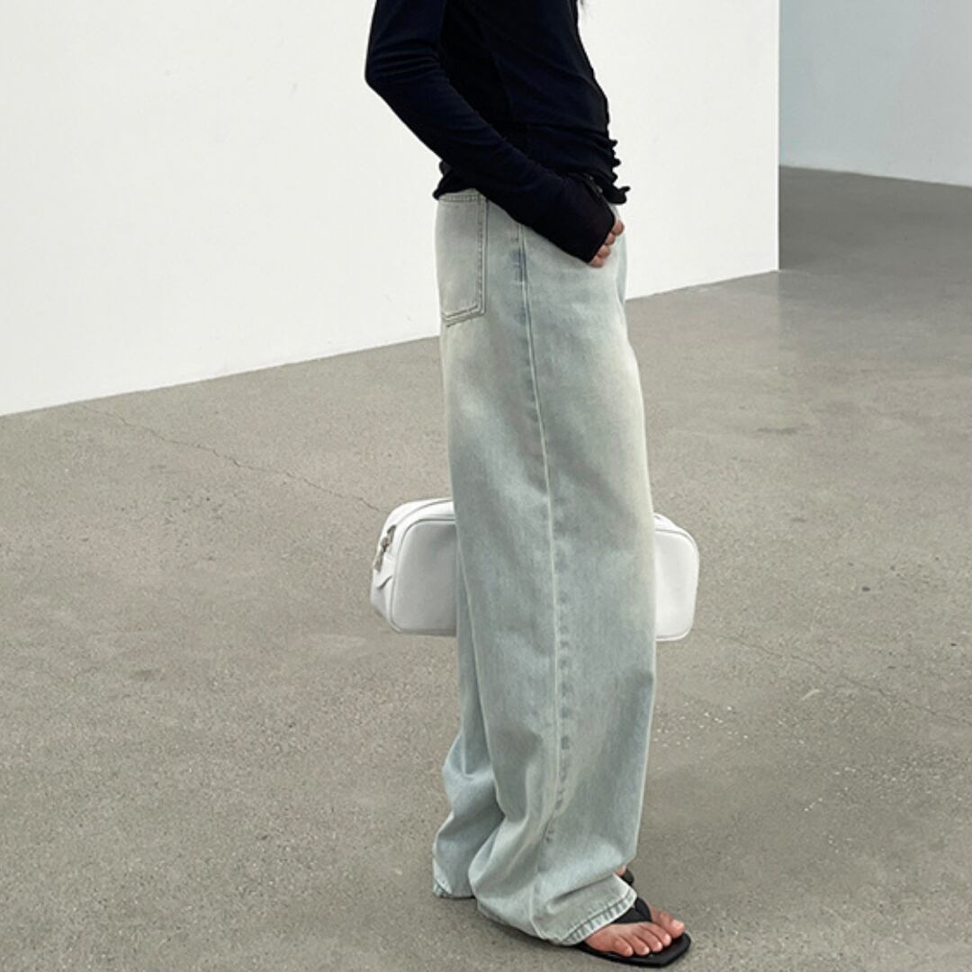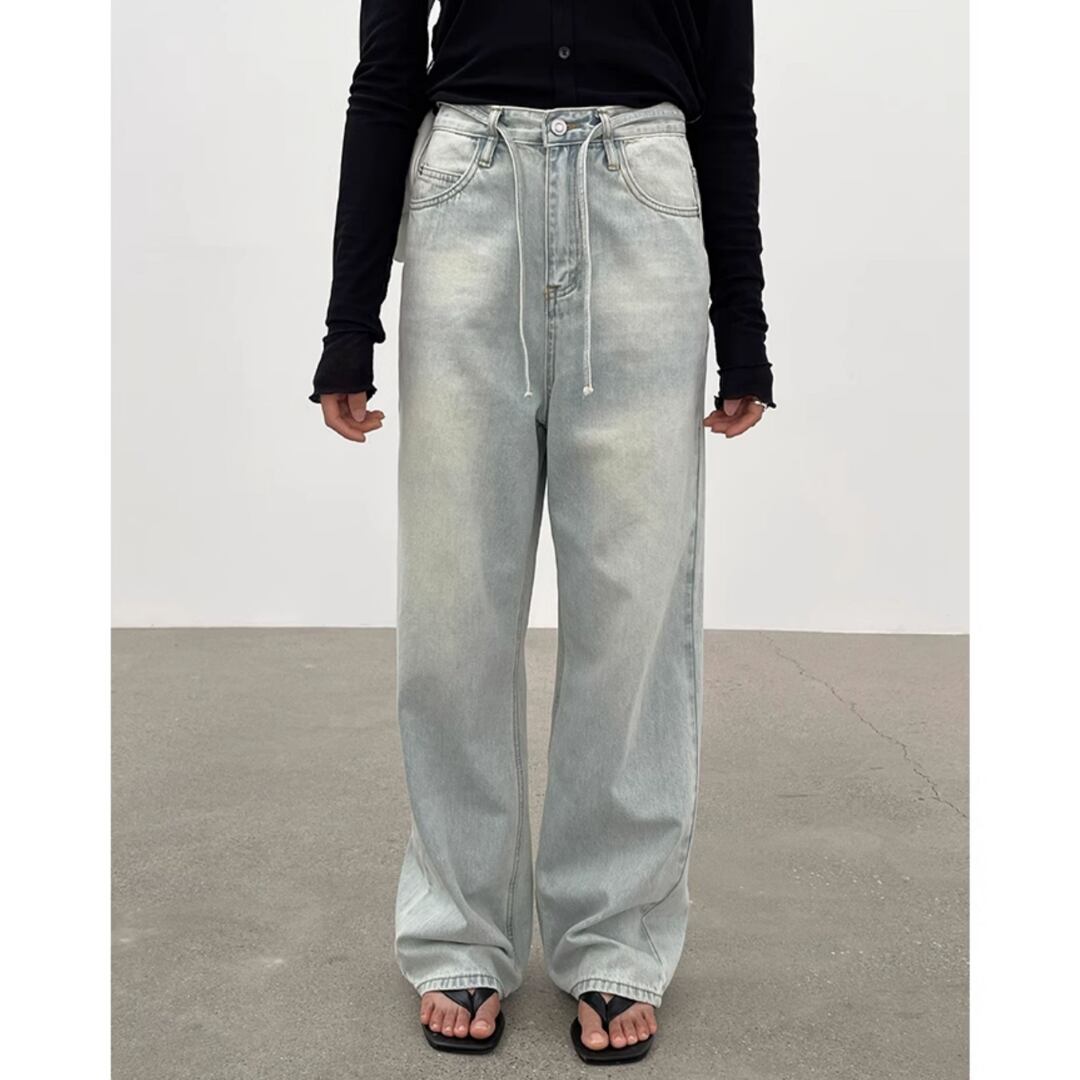 腰位置を高く見せてくれるハイウエストと、フロントの紐がポイントのワイドデニム。