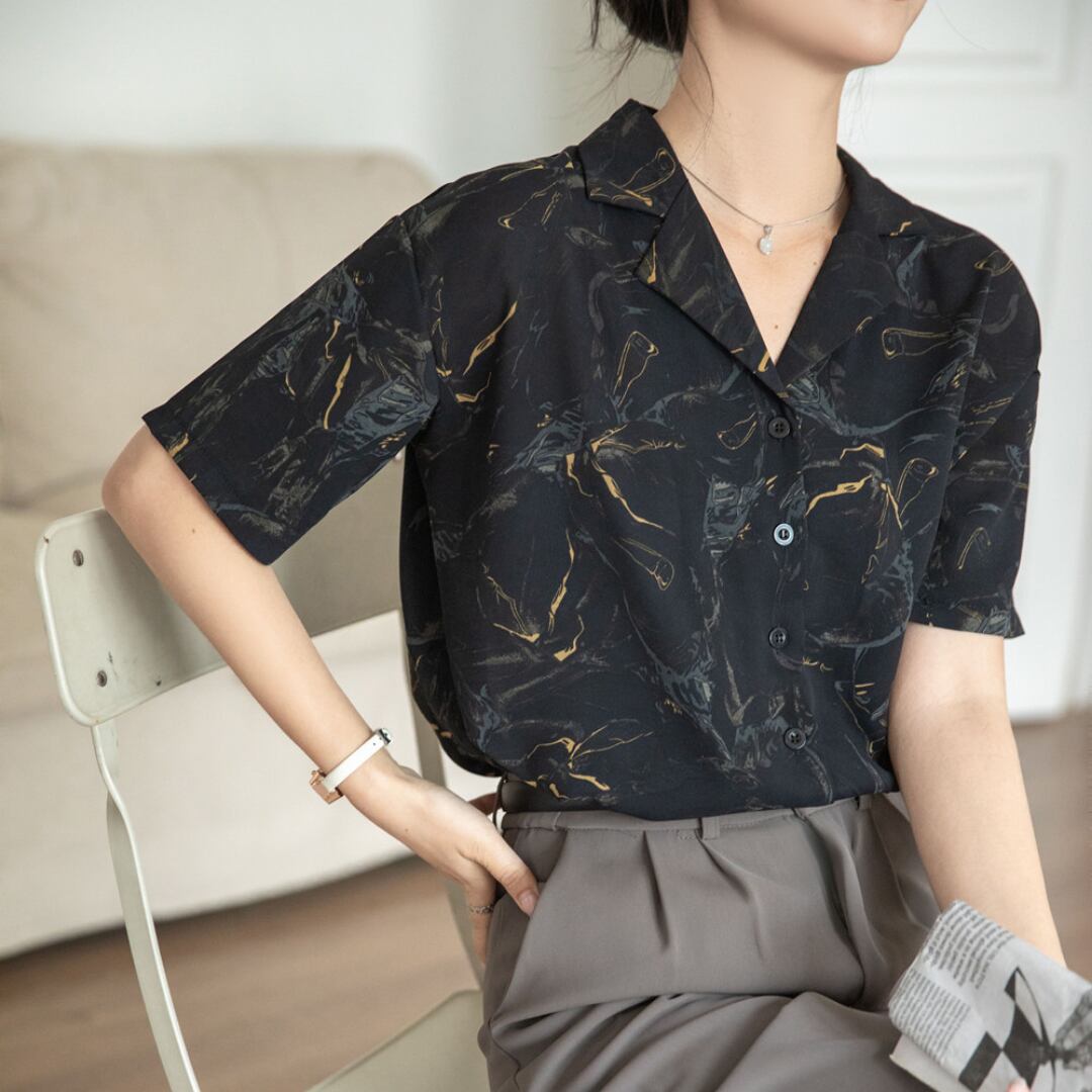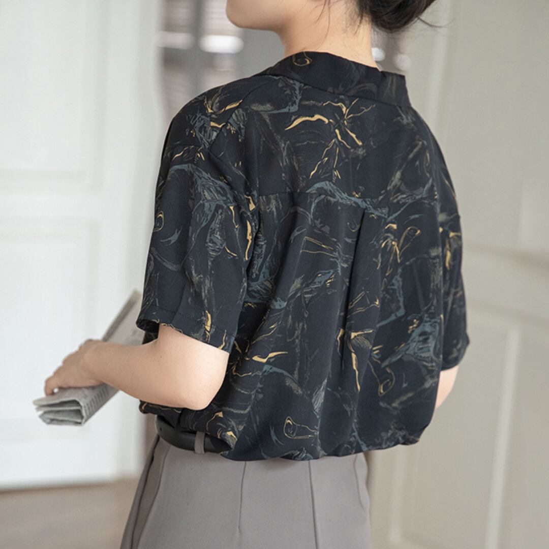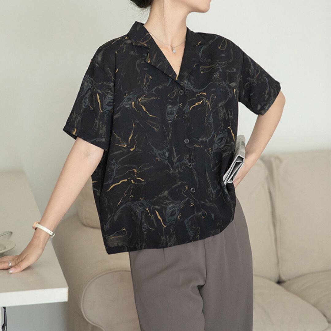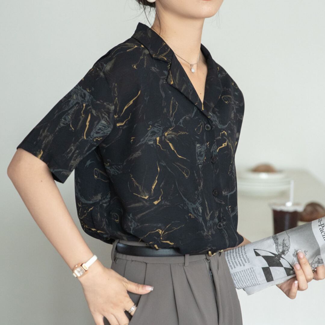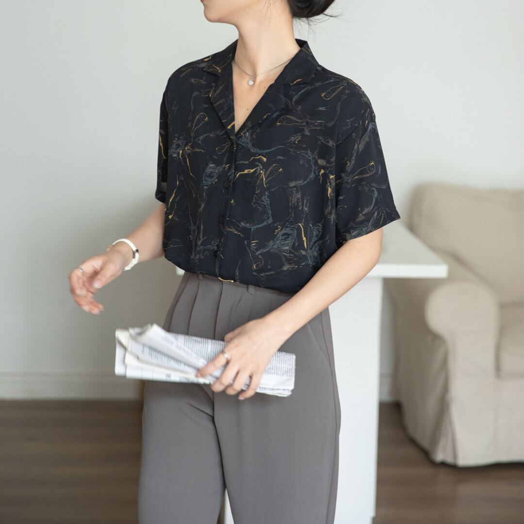 グレイッシュな模様が動きのある表情をつくり、シンプルなボトムスに合わせるだけで、抜け感のある大人カジュアルなスタイルに◎