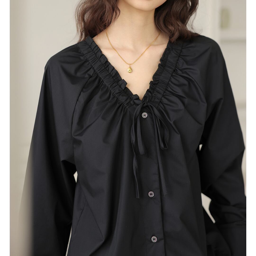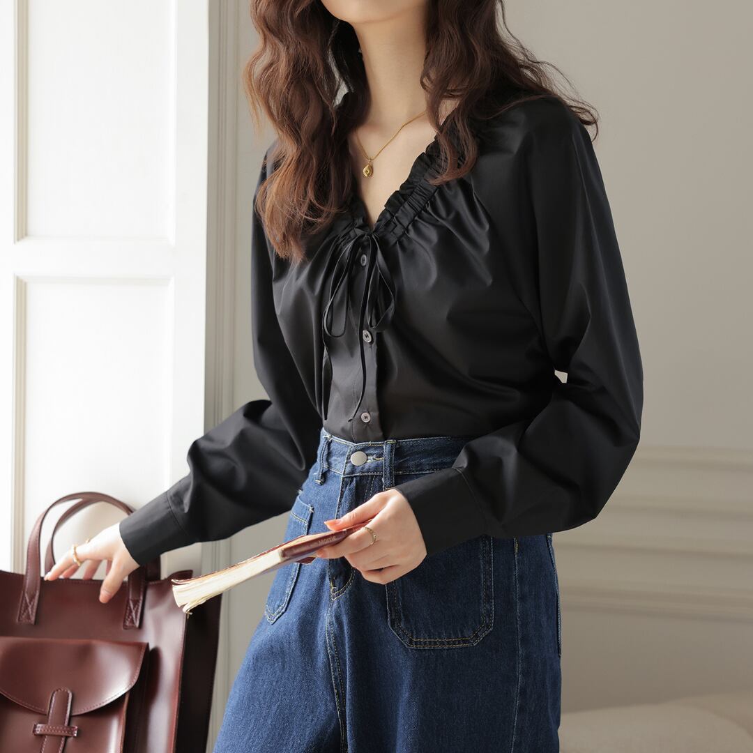 Vネックの抜け感で首元はすっきり、リボンでほんのり甘さをプラスしても◎