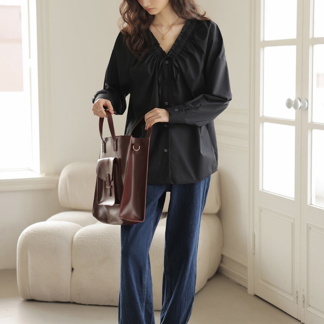 ほどよい光沢感と、ギャザーのディテールが女性らしさを引き立てる1枚。