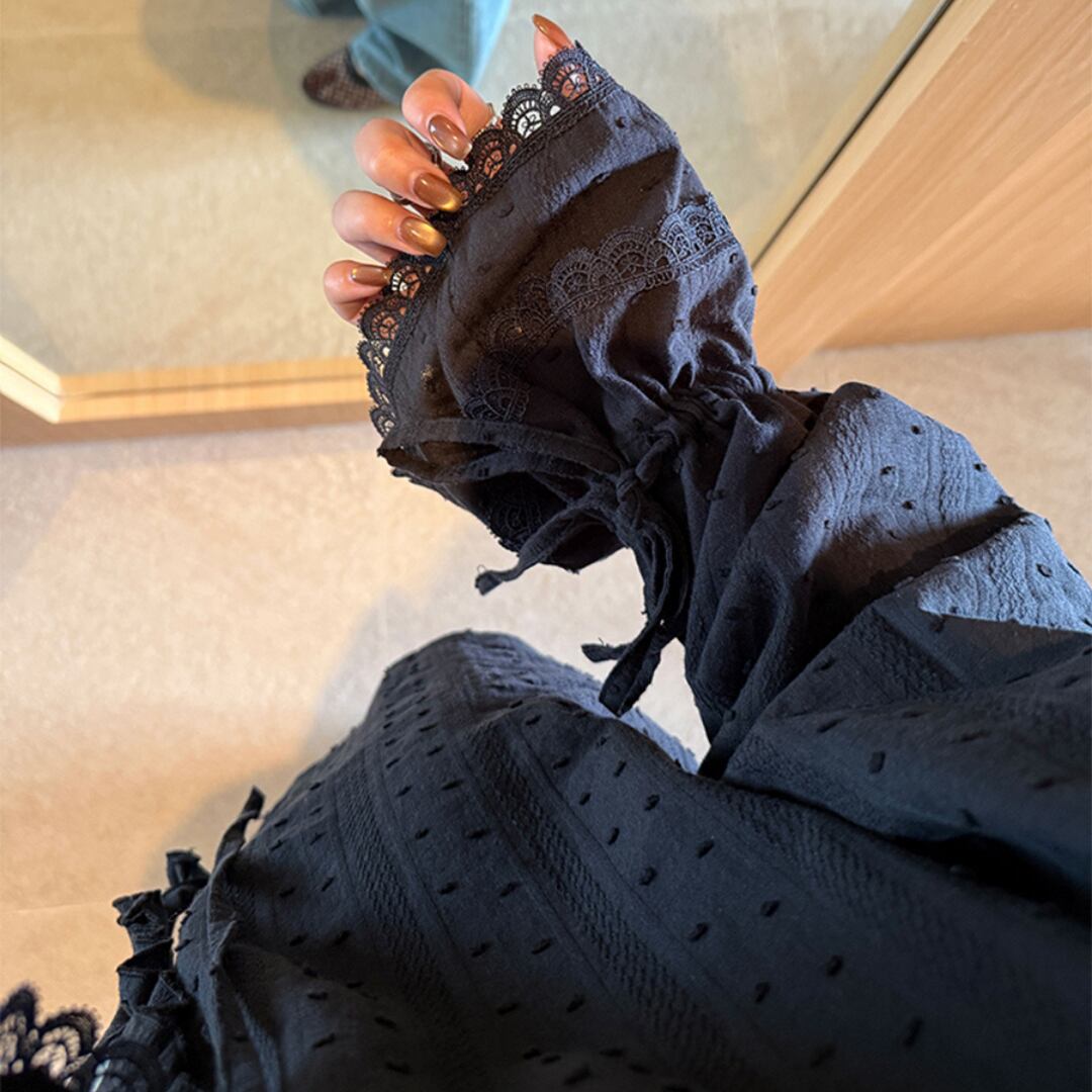 ドット柄のふんわりした生地に、さり気なくフリルとレースをあしらった1枚。