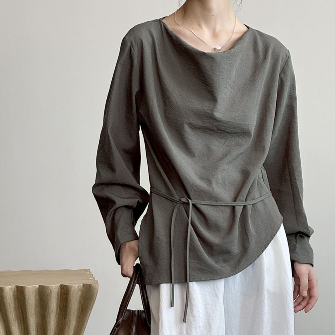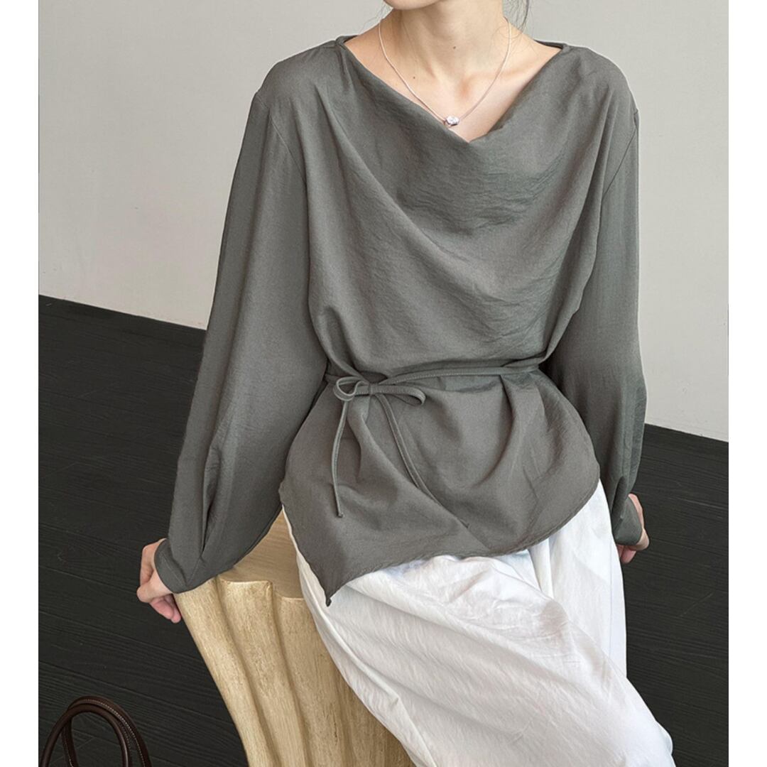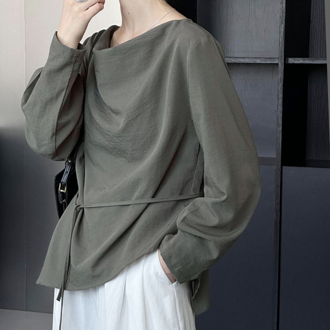 なめらかなドレープとウエストマークの紐が、女性らしいシルエットをつくる上品ブラウス。