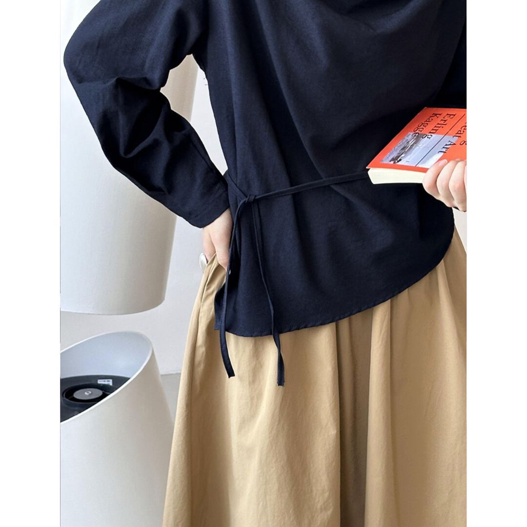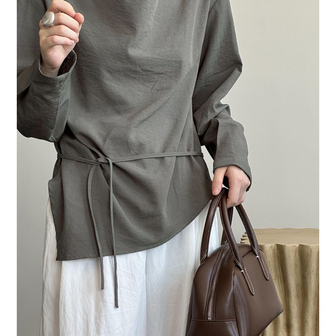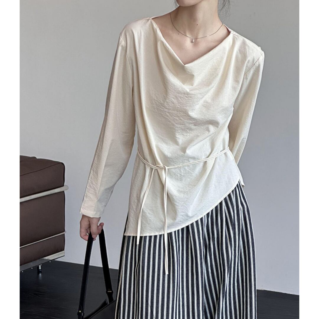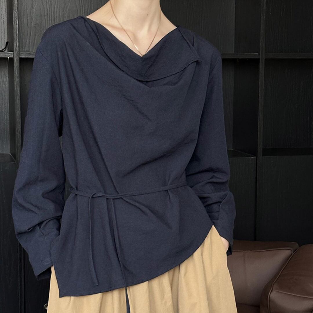 なめらかなドレープとウエストマークの紐が、女性らしいシルエットをつくる上品ブラウス。