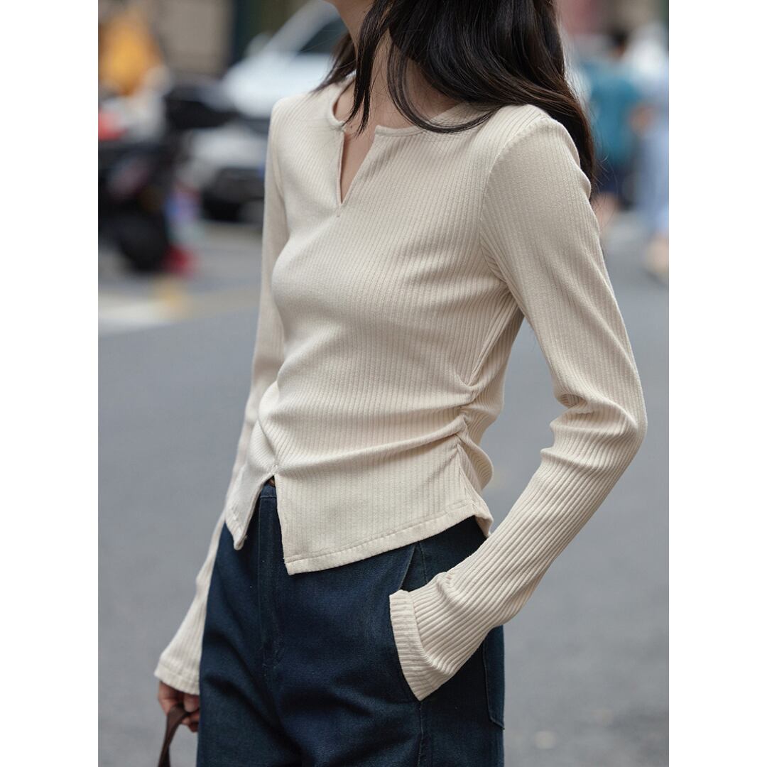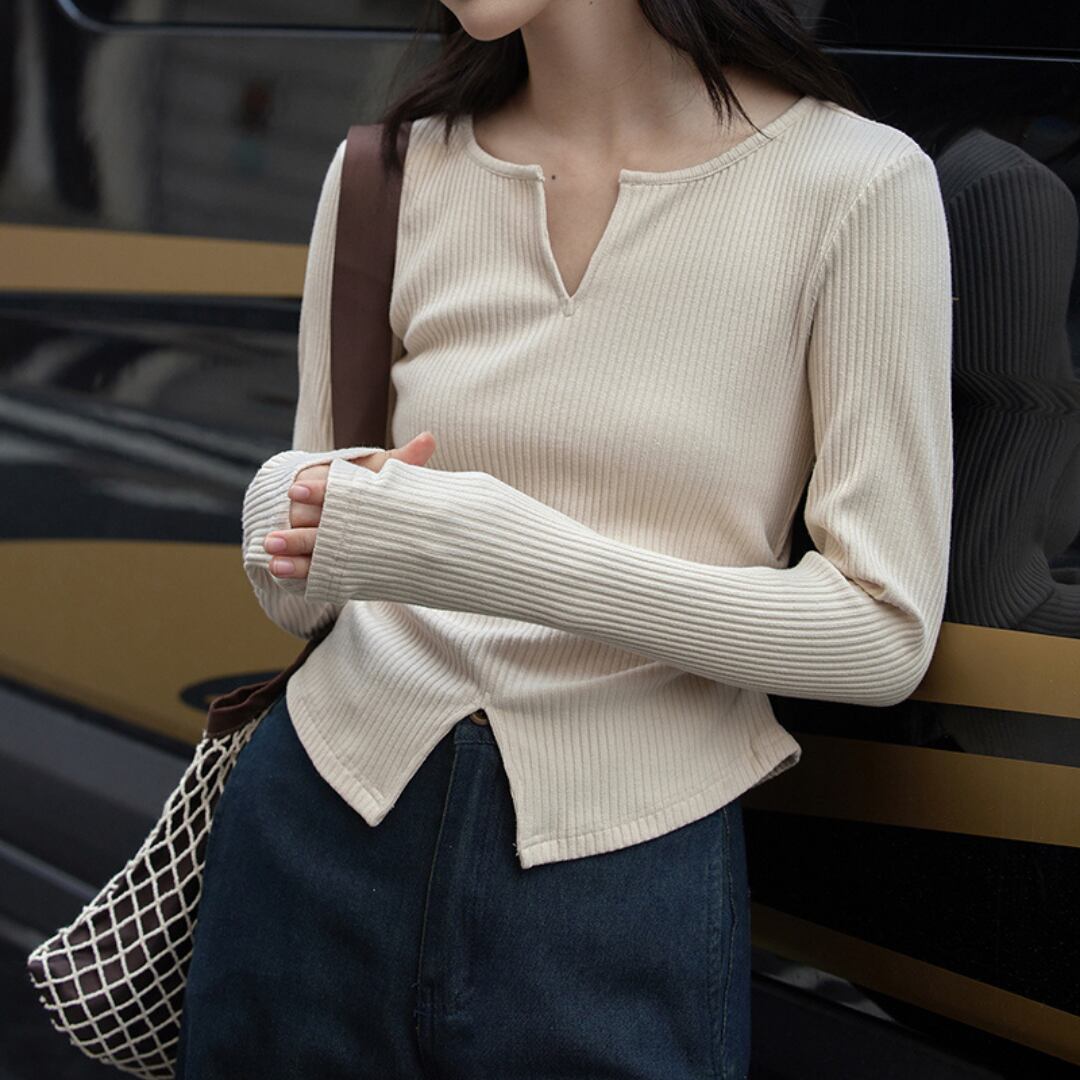 胸元と裾のスリットが、抜け感をプラスするリブトップス。